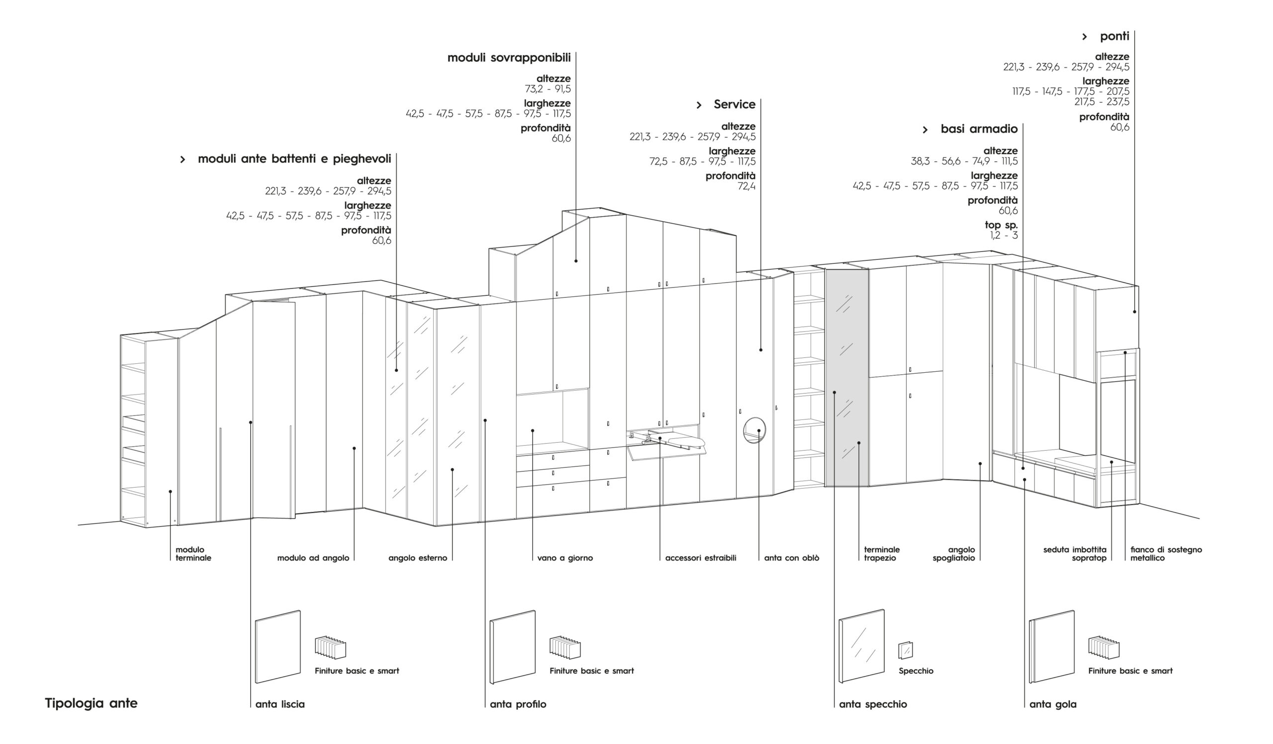 Dedicato a chi cerca una soluzione salvaspazio che garantisca ordine e organizzazione. L’armadio Service è infatti progettato per arredare le stanze di servizio, dove riporre elettrodomestici e oggetti per la pulizia. La gamma di finiture e colori disponibili permette di vestire con gusto i diversi locali, senza per questo rinunciare a soluzioni ottimizzate in termini di componibilità e qualità dei materiali. In presenza di spazi ridotti è possibile scegliere, tra le diverse versioni di anta, quella più adatta al progetto: battente, pieghevole, con oblò. Tanti accessori per completare l’armadio Service, come il cesto portabiancheria e l’asse da stiro ribaltabile.