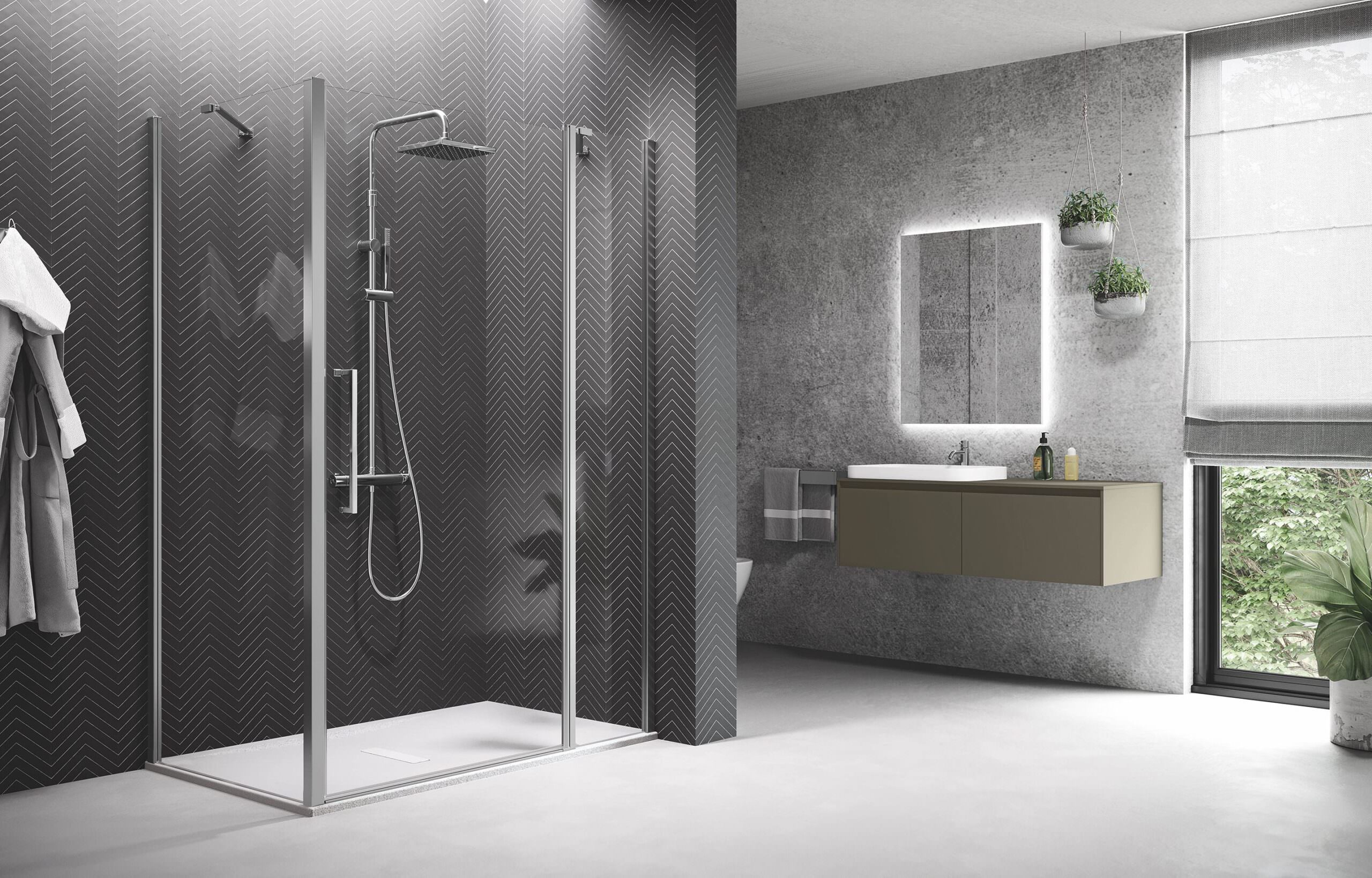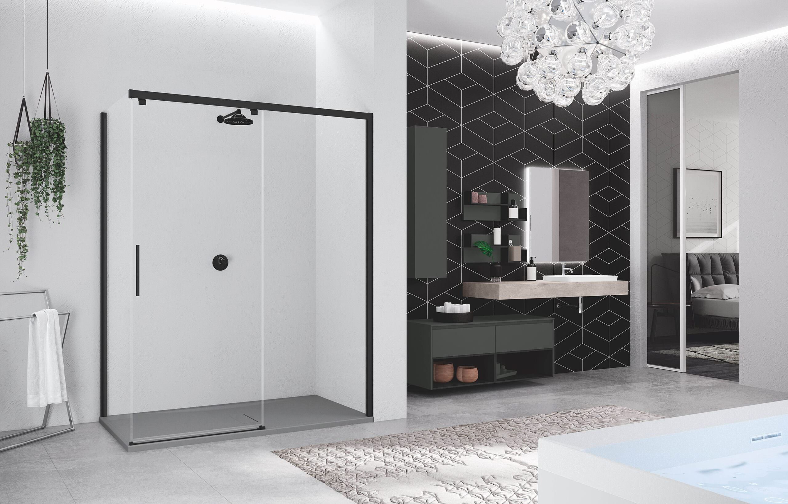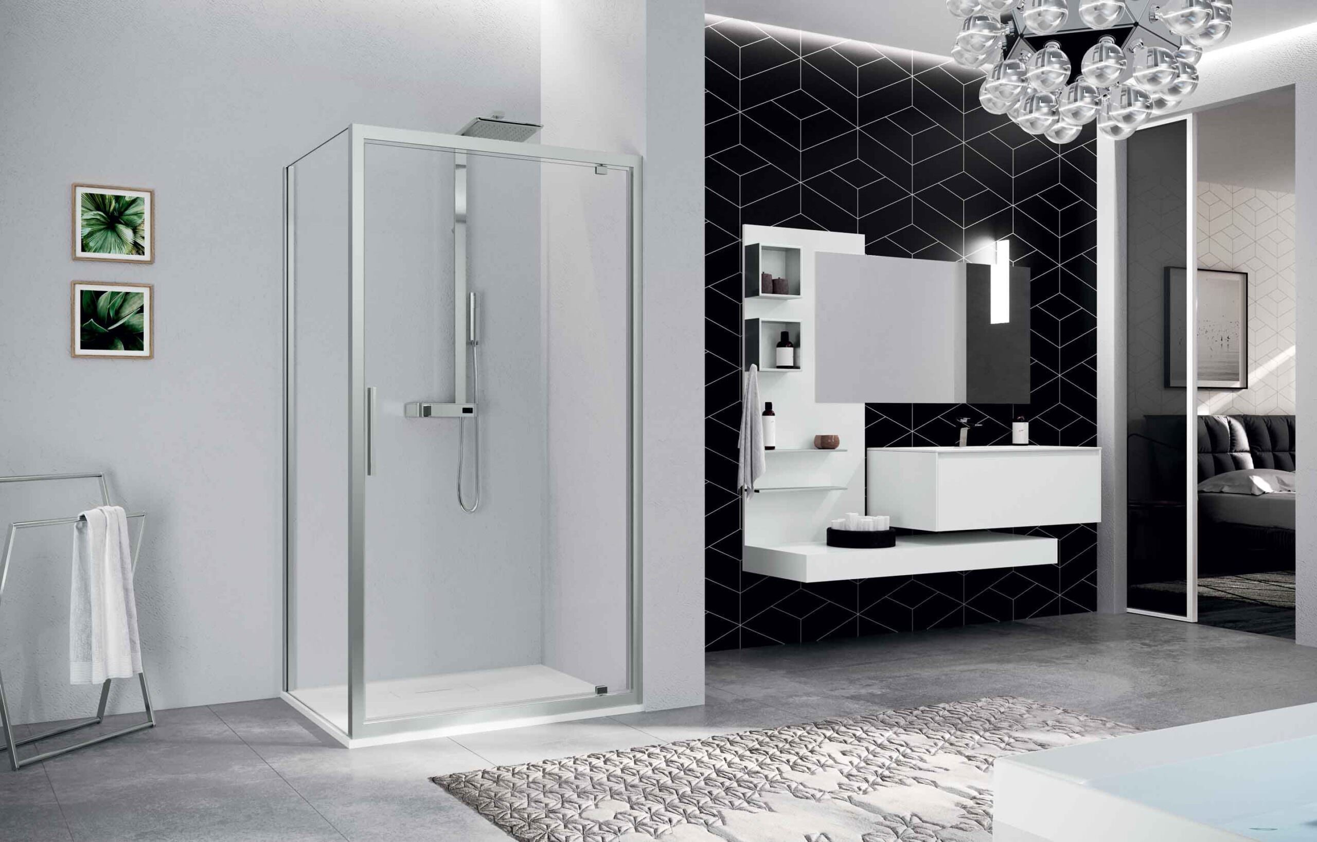 A rendere l’ambiente elegante e importante è, inoltre, la vasta gamma di finiture dei profili e dei vetri dei vani doccia.