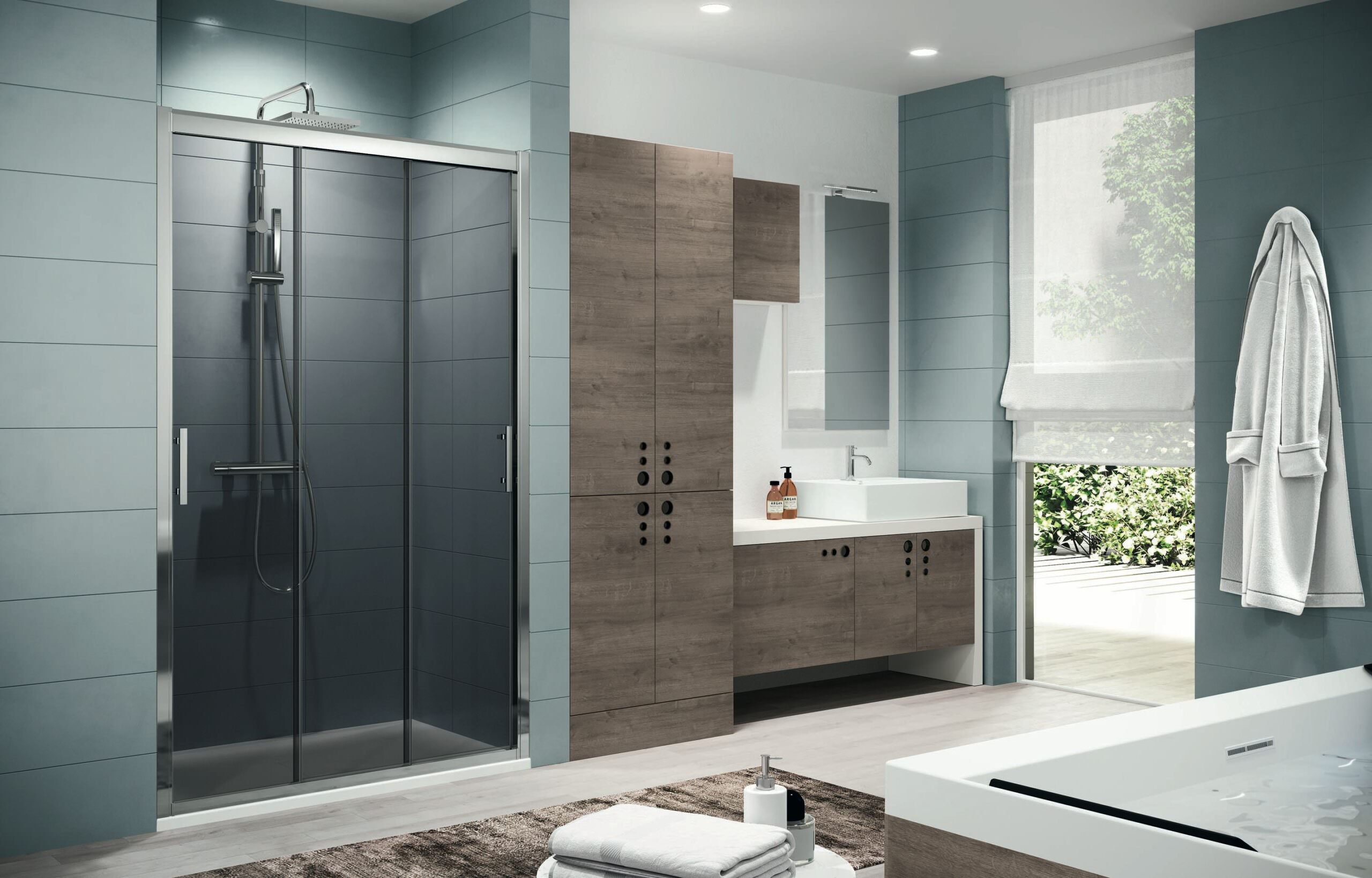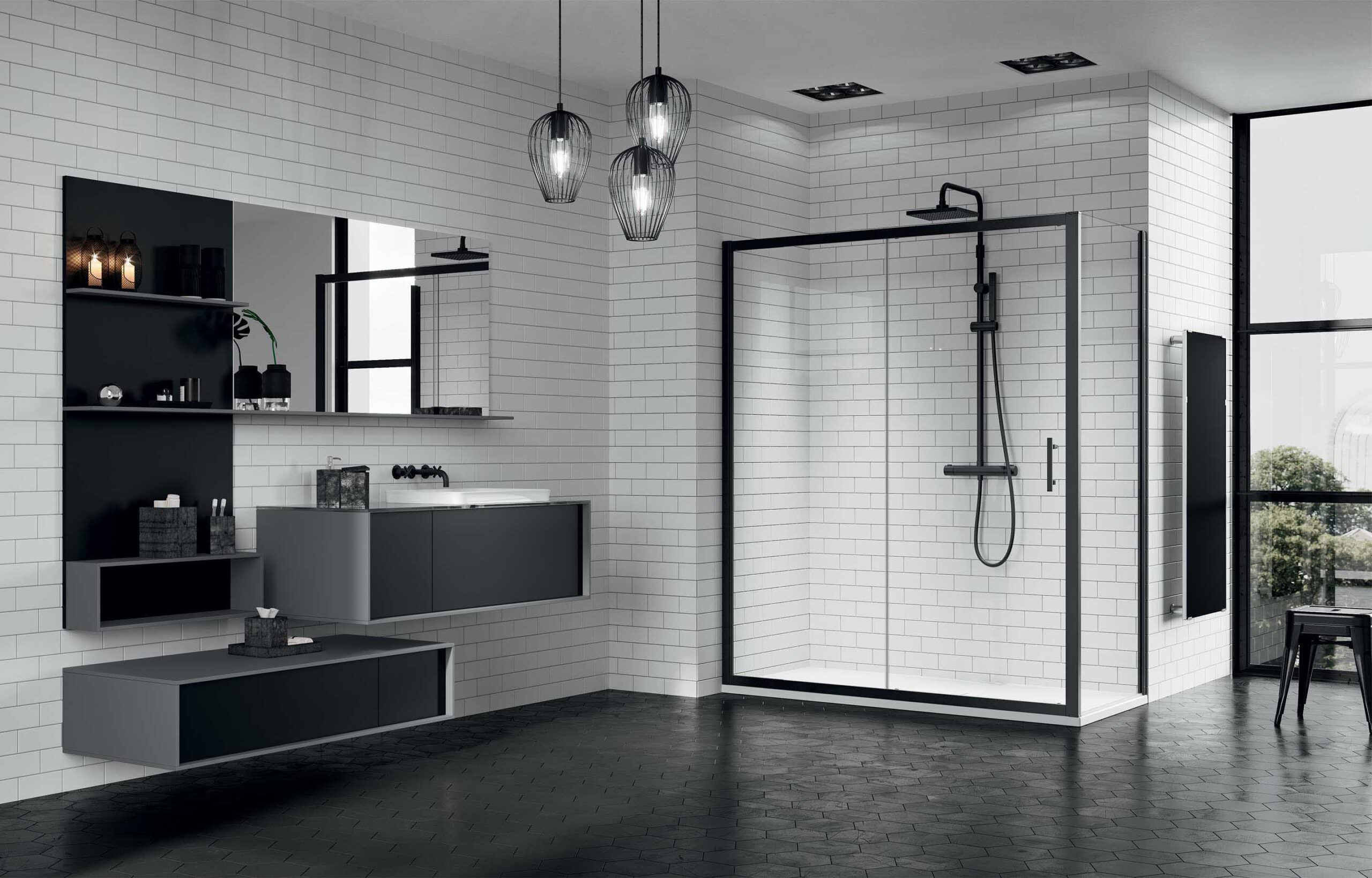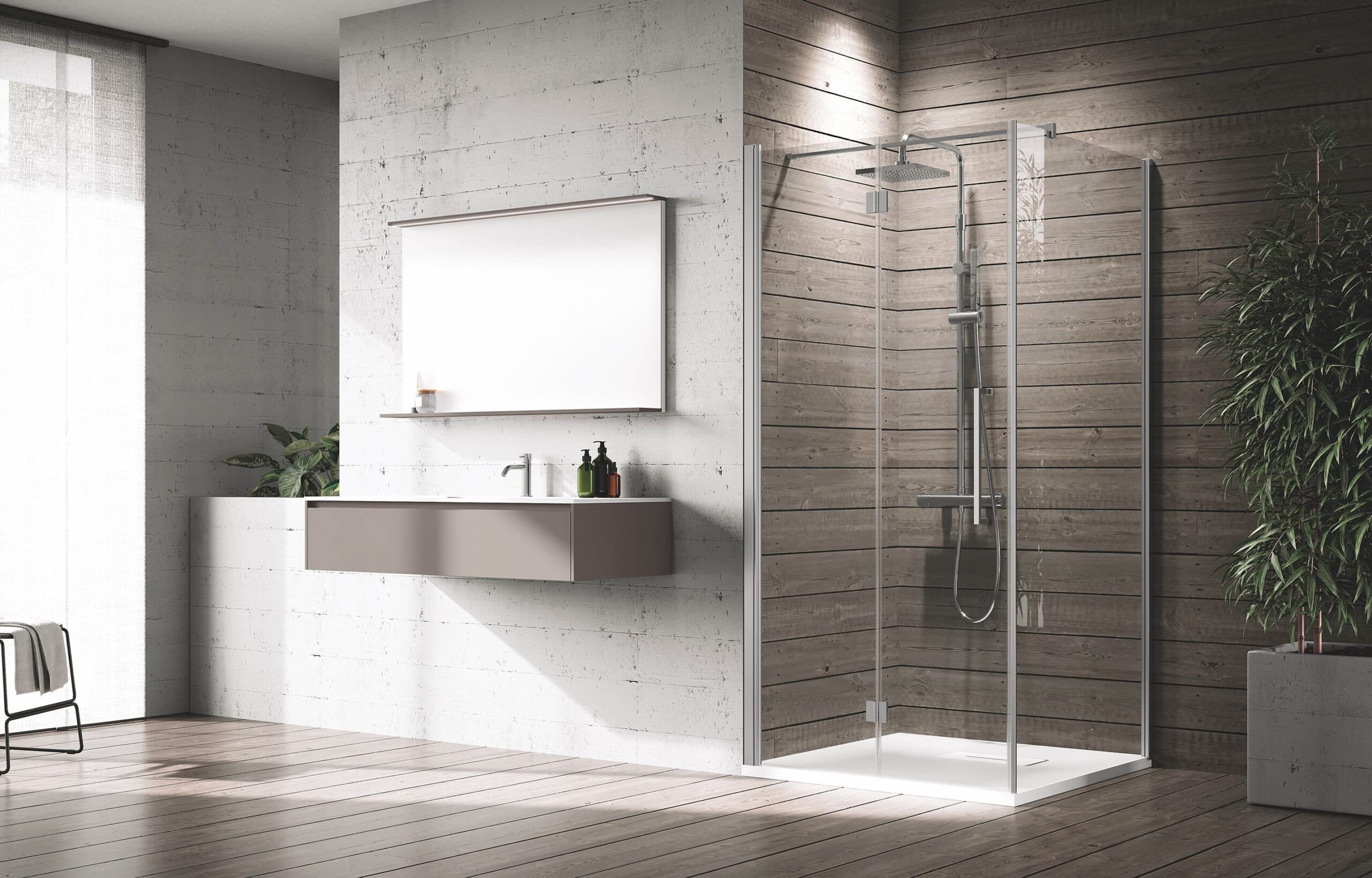 A rendere l’ambiente elegante e importante è, inoltre, la vasta gamma di finiture dei profili e dei vetri dei vani doccia.