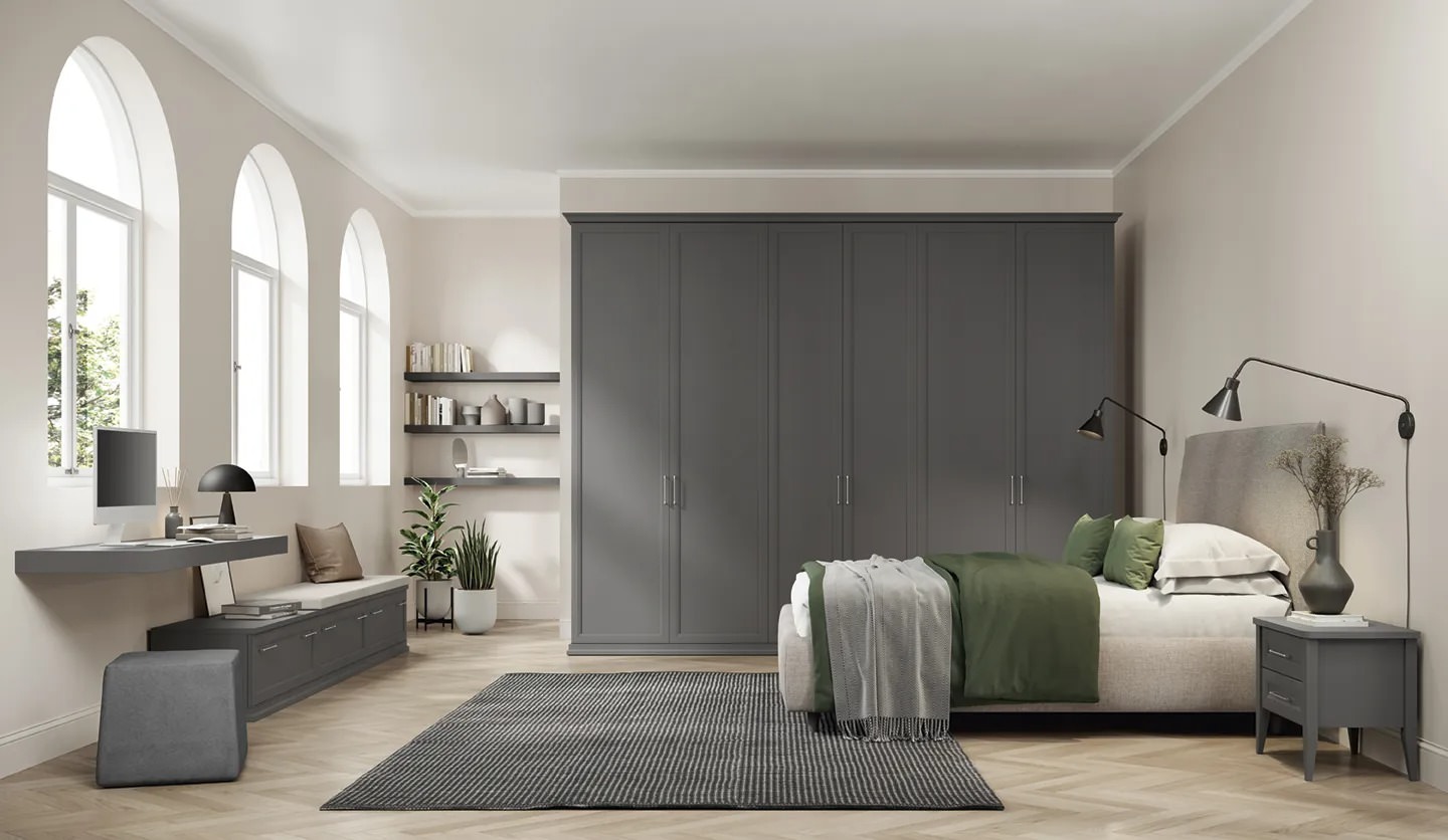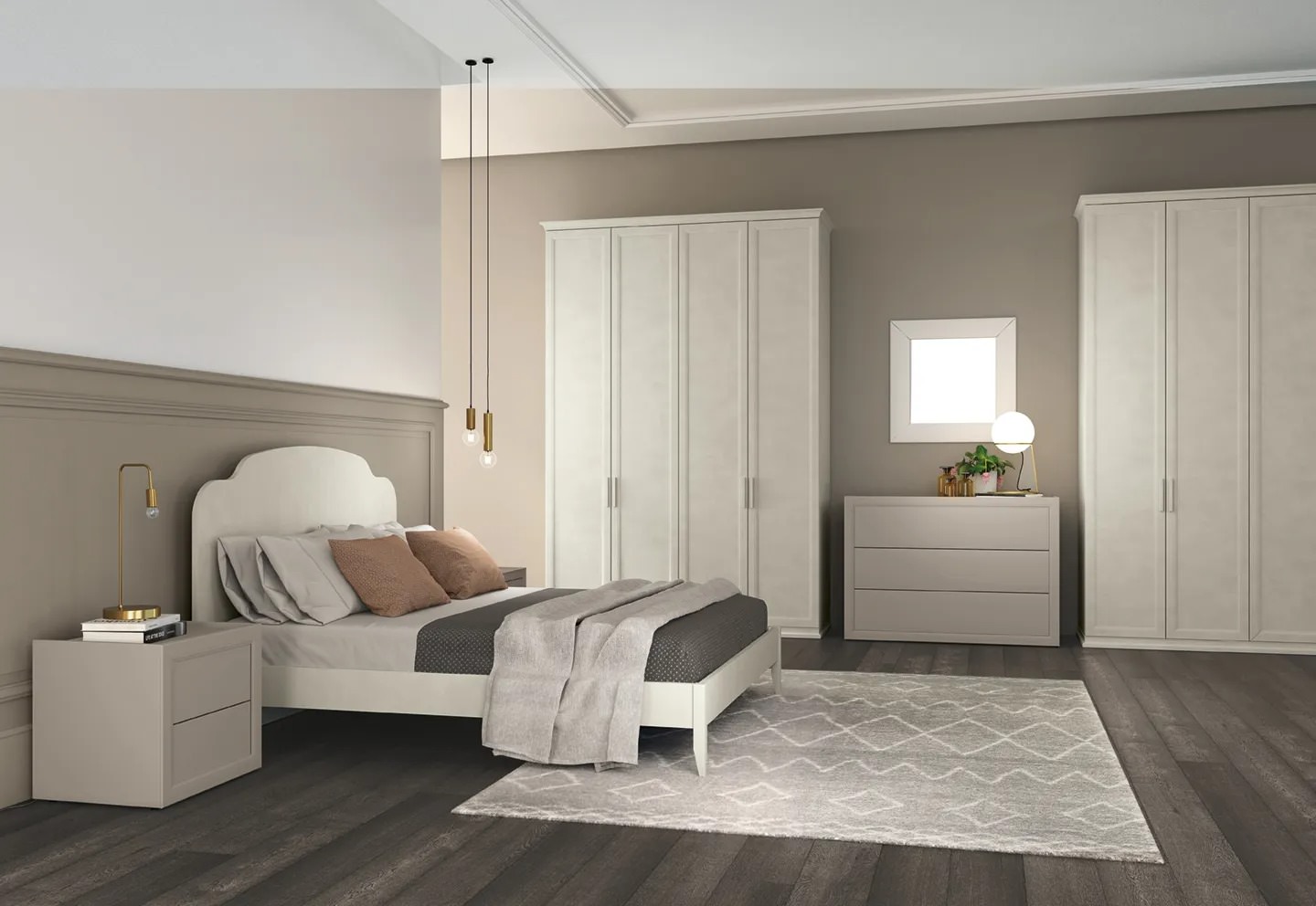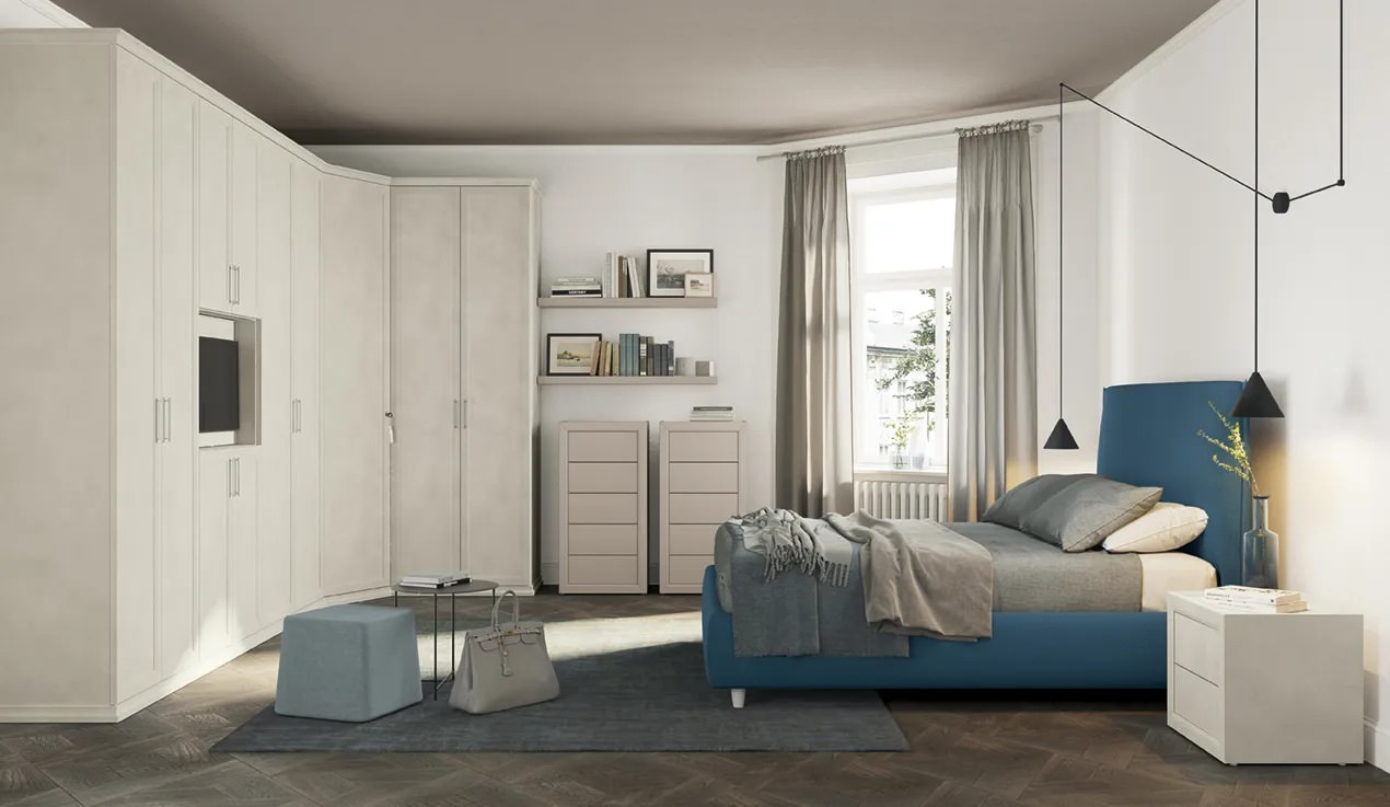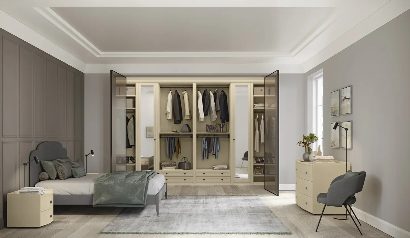 Camere matrimoniali con soluzione armadio ad anta battente. Una collezione senza tempo per la zona notte declinata attraverso linee classiche dal gusto contemporaneo