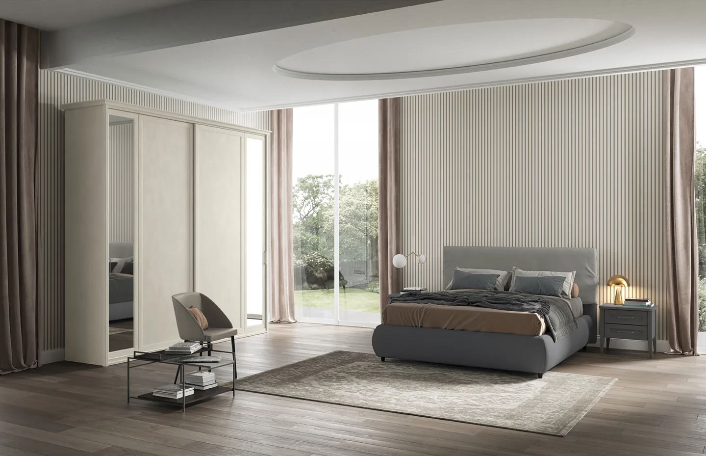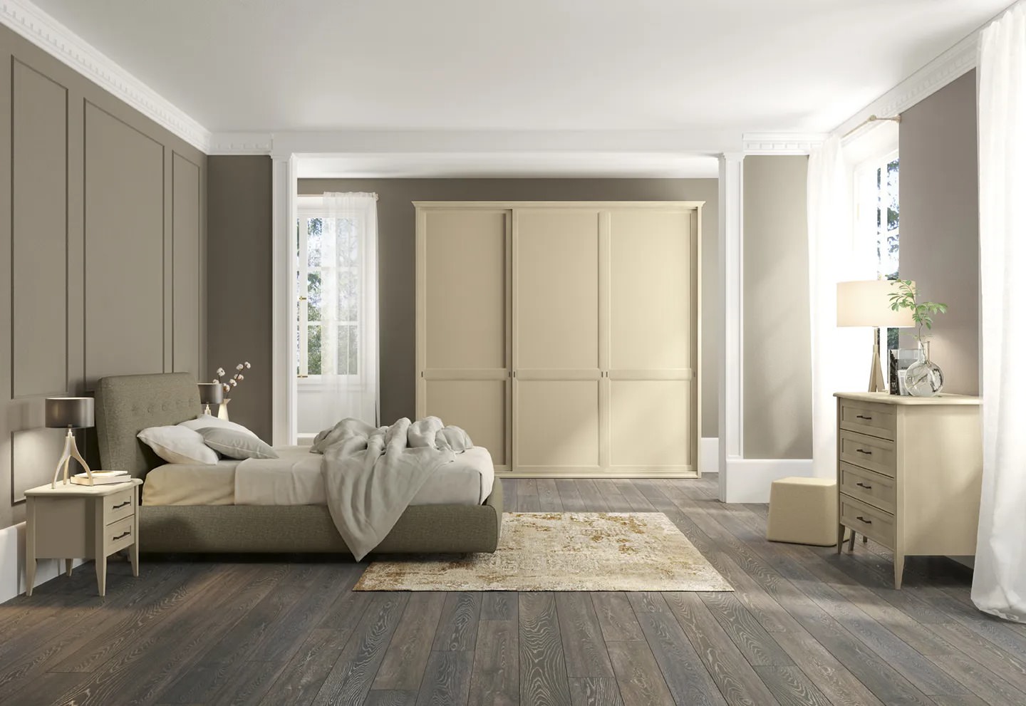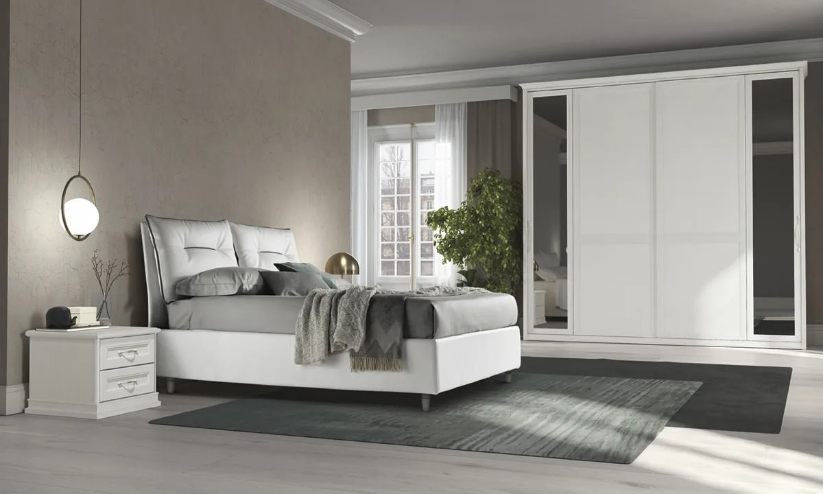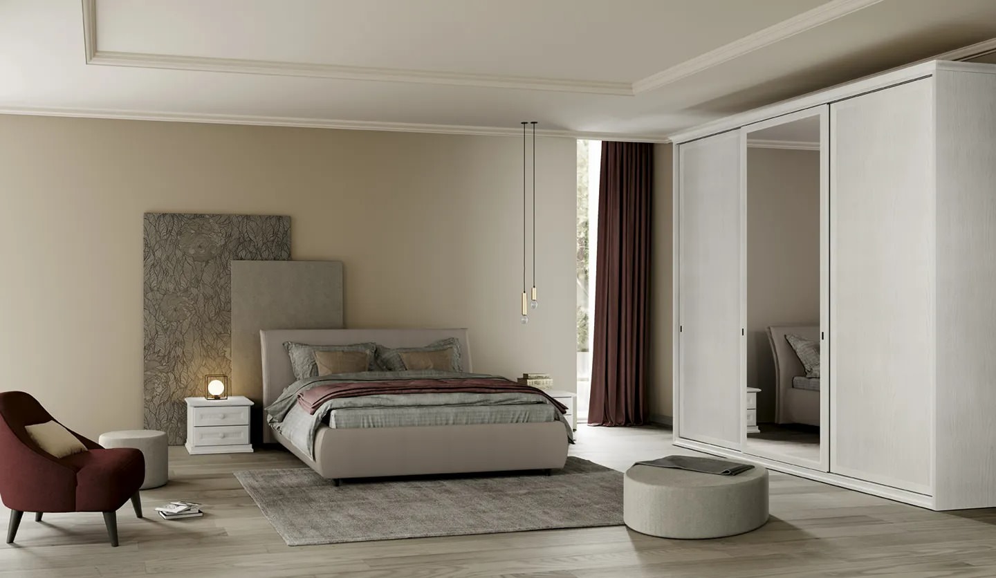 Camere matrimoniali con soluzione armadio ad anta scorrevole. Una collezione senza tempo per la zona notte declinata attraverso linee classiche dal gusto contemporaneo