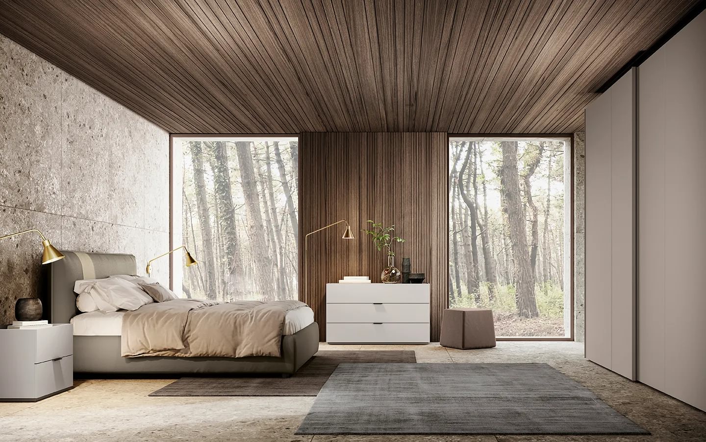 Camere matrimoniali con soluzione armadio ad anta scorrevole. Ricche di elementi di design unici, perfetti per rendere ogni ambiente elegante ed accogliente come i componibili a terra su base e piedini Sigma. Gli elementi delle nostre camere possono essere integrati con top con ricarica wireless e pensili con anta e vani a giorno.