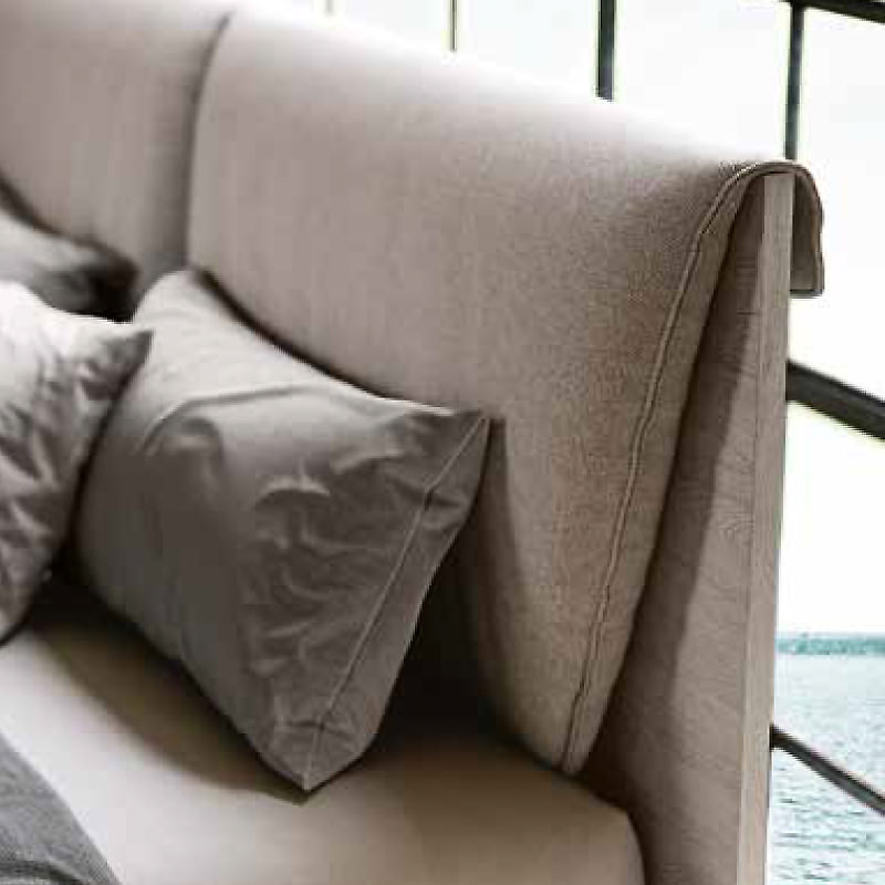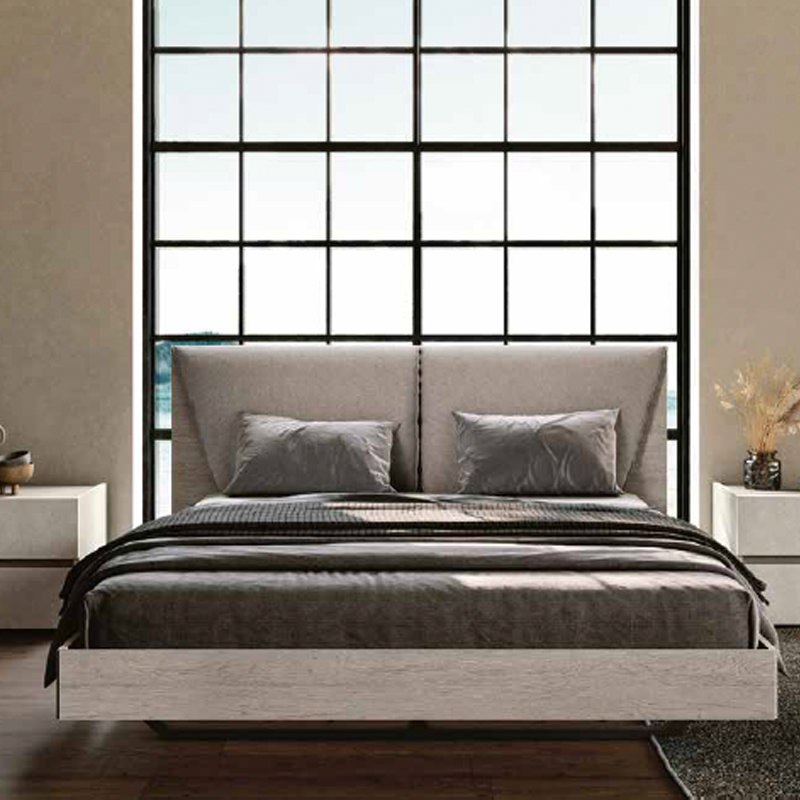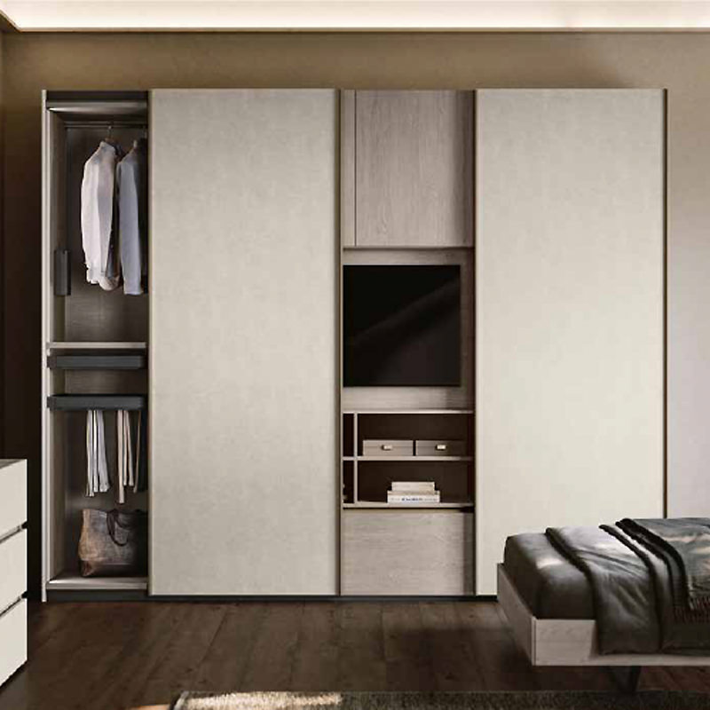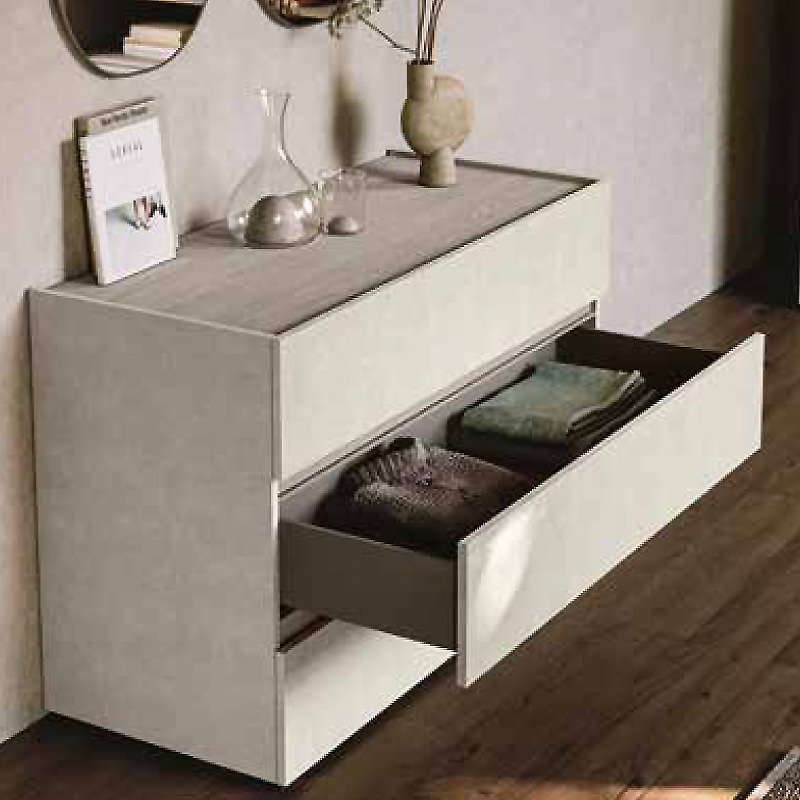 La singolarità della composizione risiede nell’abbinamento armonico delle finiture rovere gessato e spatolato bianco.