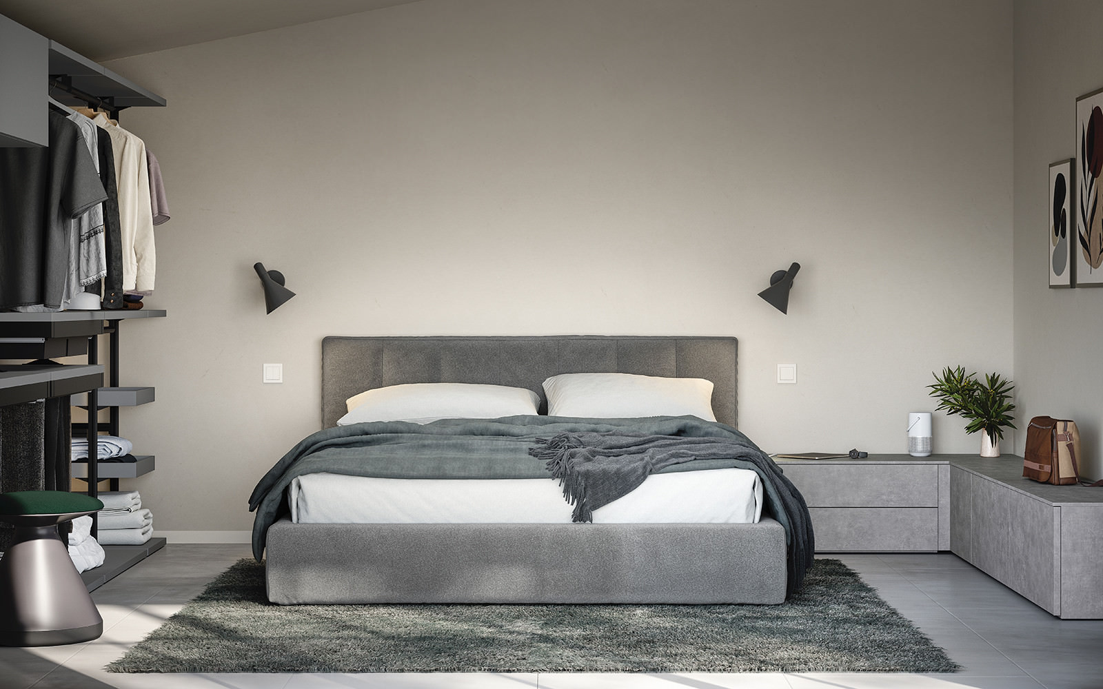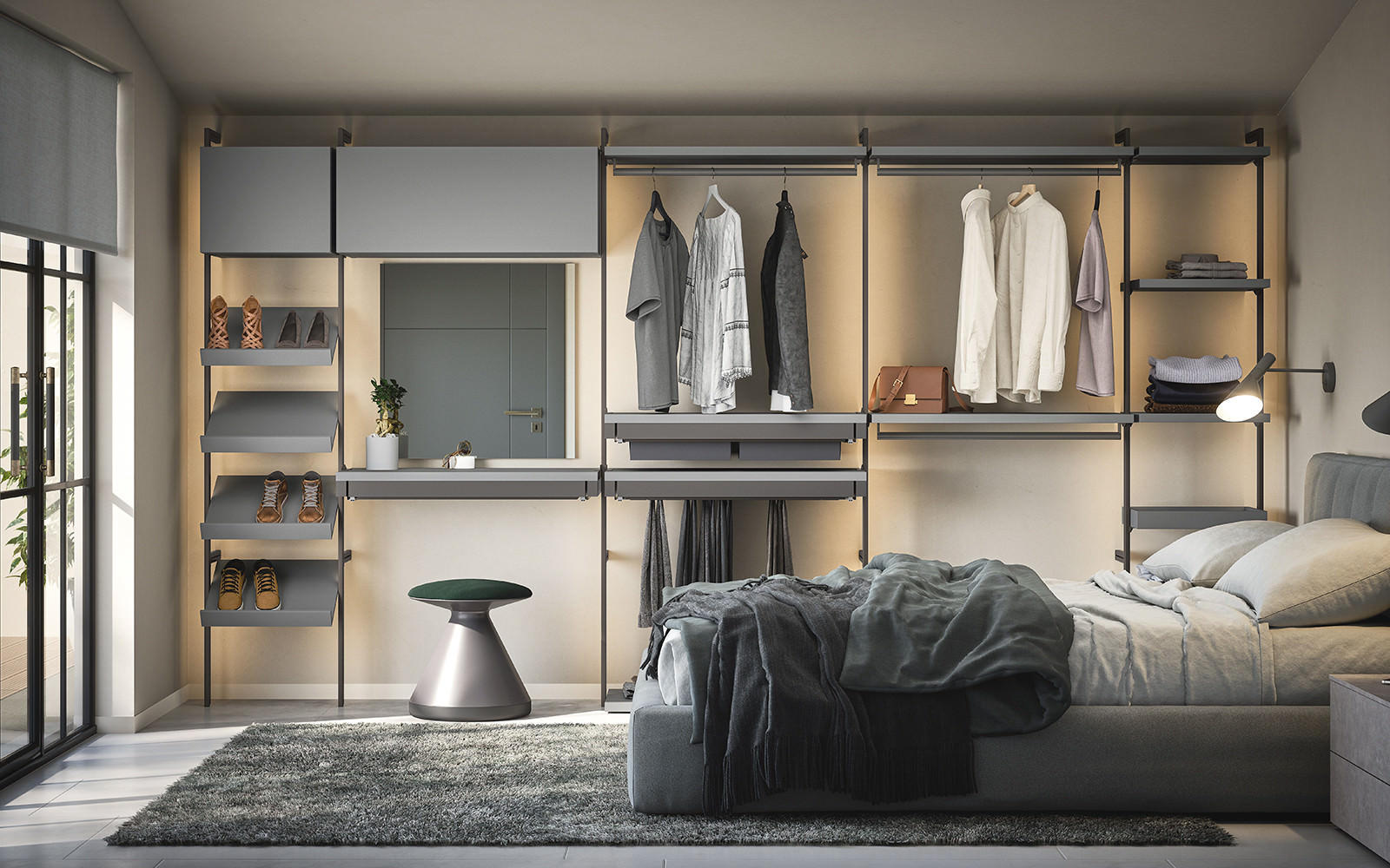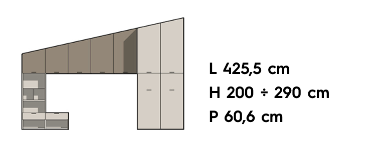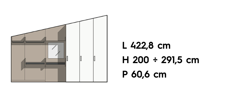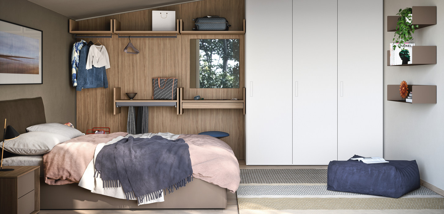 Gli elementi modulari del sistema permettono di utilizzare al meglio lo spazio in presenza di una camera mansardata. È infatti possibile realizzare un guardaroba organizzato o una composizione armadio su misura per assecondare le esigenze di un ribassamento o mansarda.