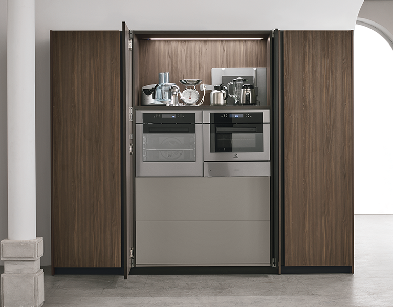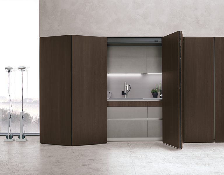 Le cucine a scomparsa Stosa Cucine si distinguono per il loro design intelligente e la cura dei dettagli, con mobili che nascondono gli elementi essenziali dietro pannelli scorrevoli.