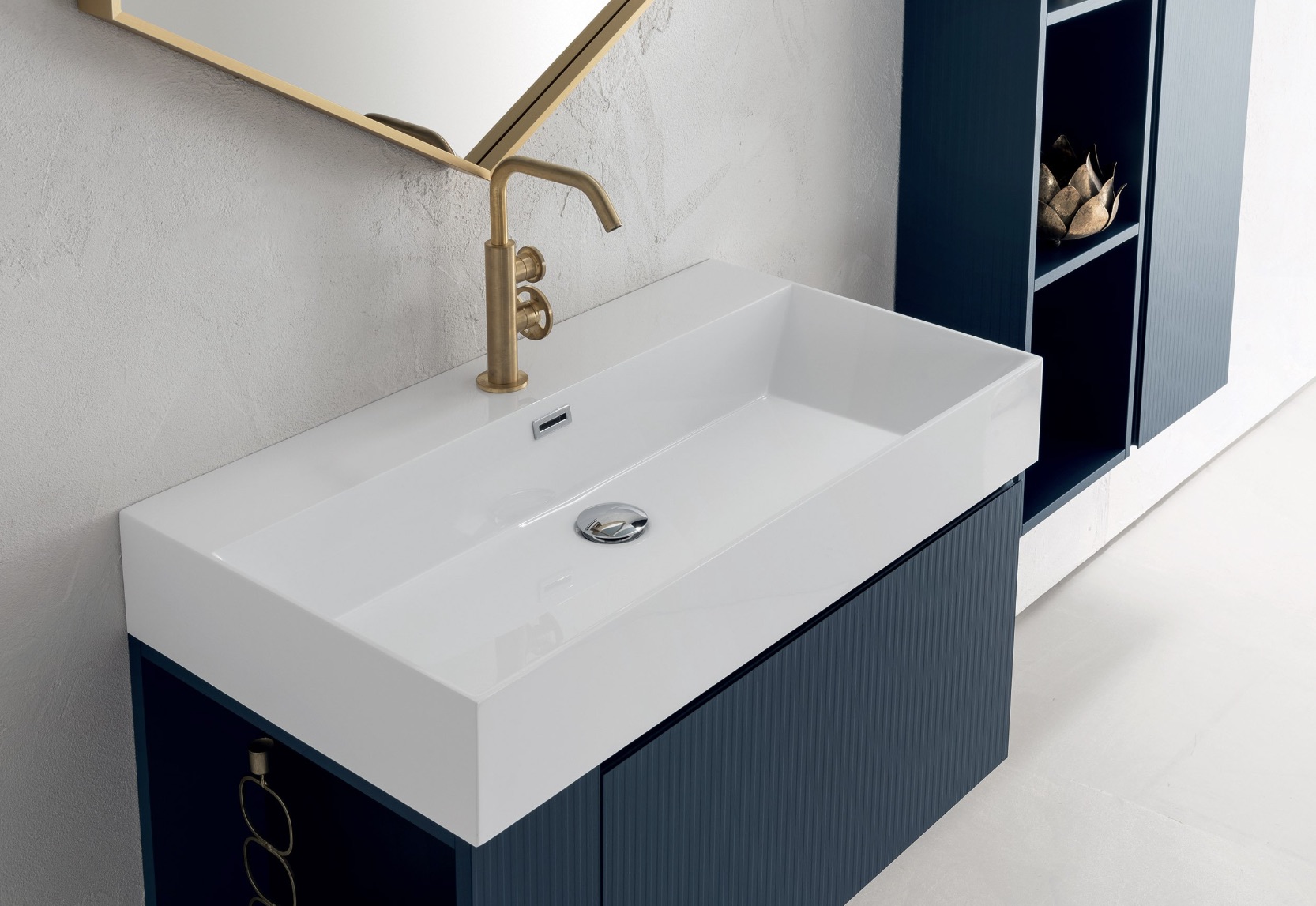 Consiglio d’arredo: opta per piastrelle o dettagli in blu petrolio nel bagno per un effetto sofisticato e accogliente.