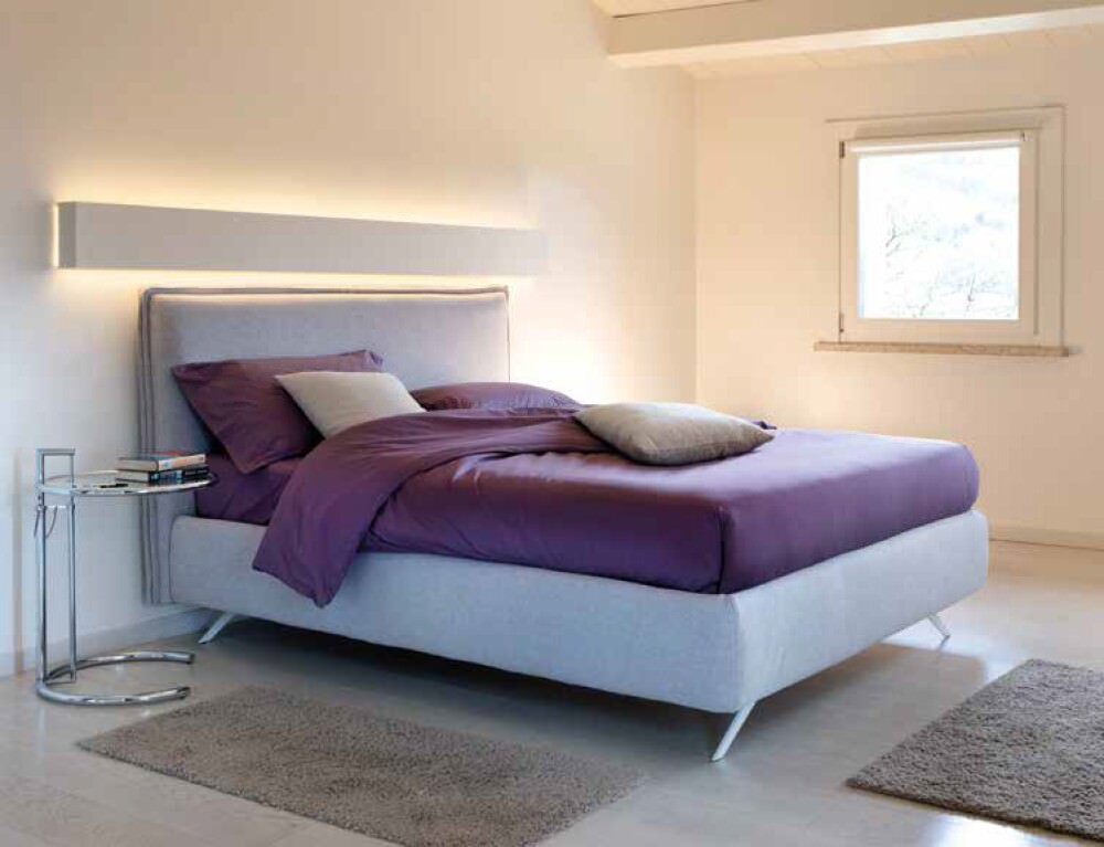 Il letto può essere rivestito in una vasta gamma di materiali che include tessuto, pelle, ecopelle, velluto ed nappa, in un’ampia scelta di colori.