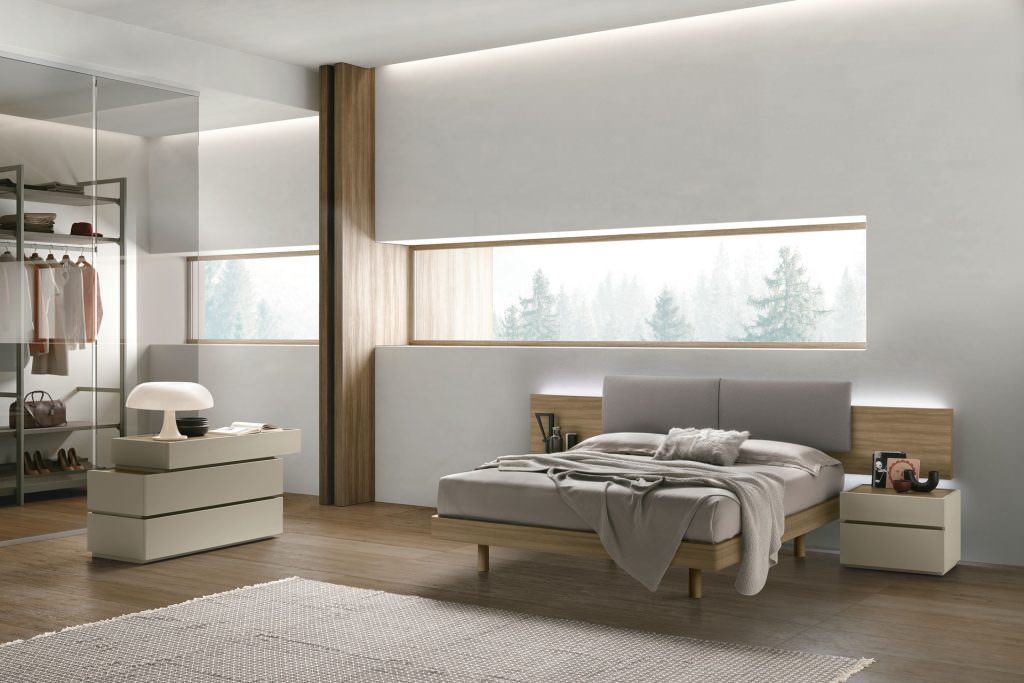 Shiro è più di un letto, è un arredo “tutto in uno”. Il pannello in materico diventa testiera: è ammorbidito da due cuscini applicati, retroilluminato da una luce a led integrata e unito ai comodini.