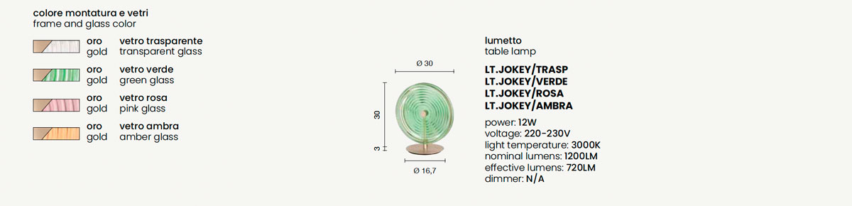 Collezione a LED in metallo verniciato e vetro decorato a righe concentriche. Montatura in metallo verniciato oro. Disponibile nella versione singola o in multipli. Cavetti regolabili in lunghezza.