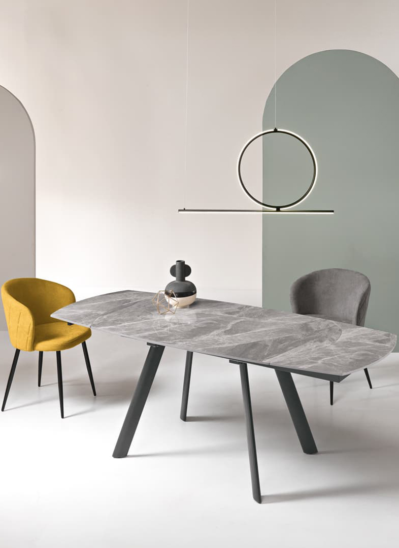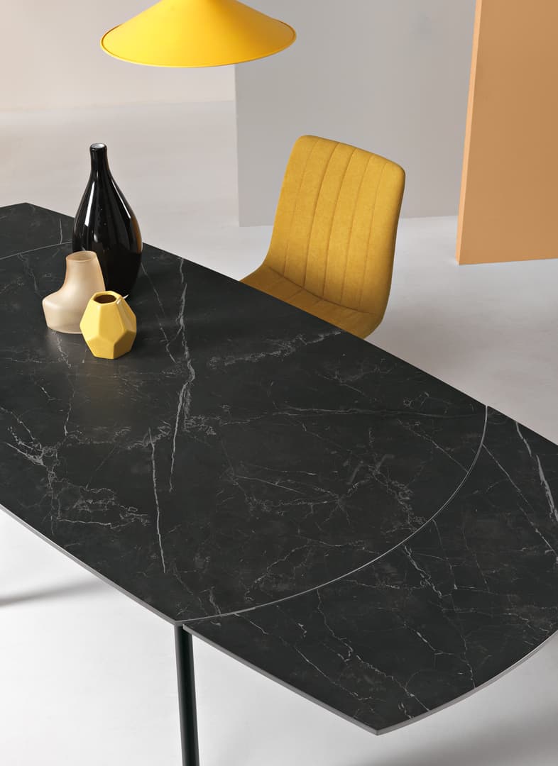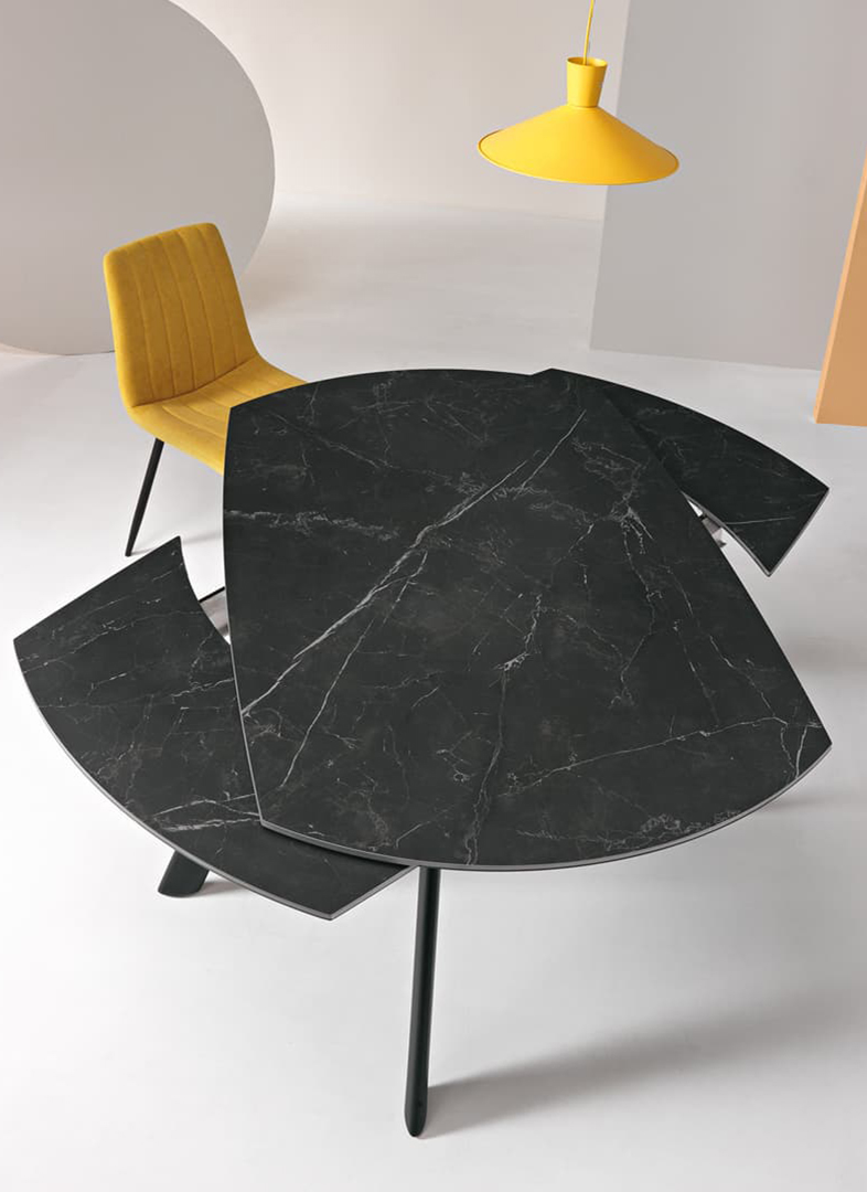 BUD è il tavolo allungabile con meccanismo a rotazione, due allunghe laterali da 30 cm. Base in metallo verniciato e piano in pietra sinterizzata effetto marmo.
