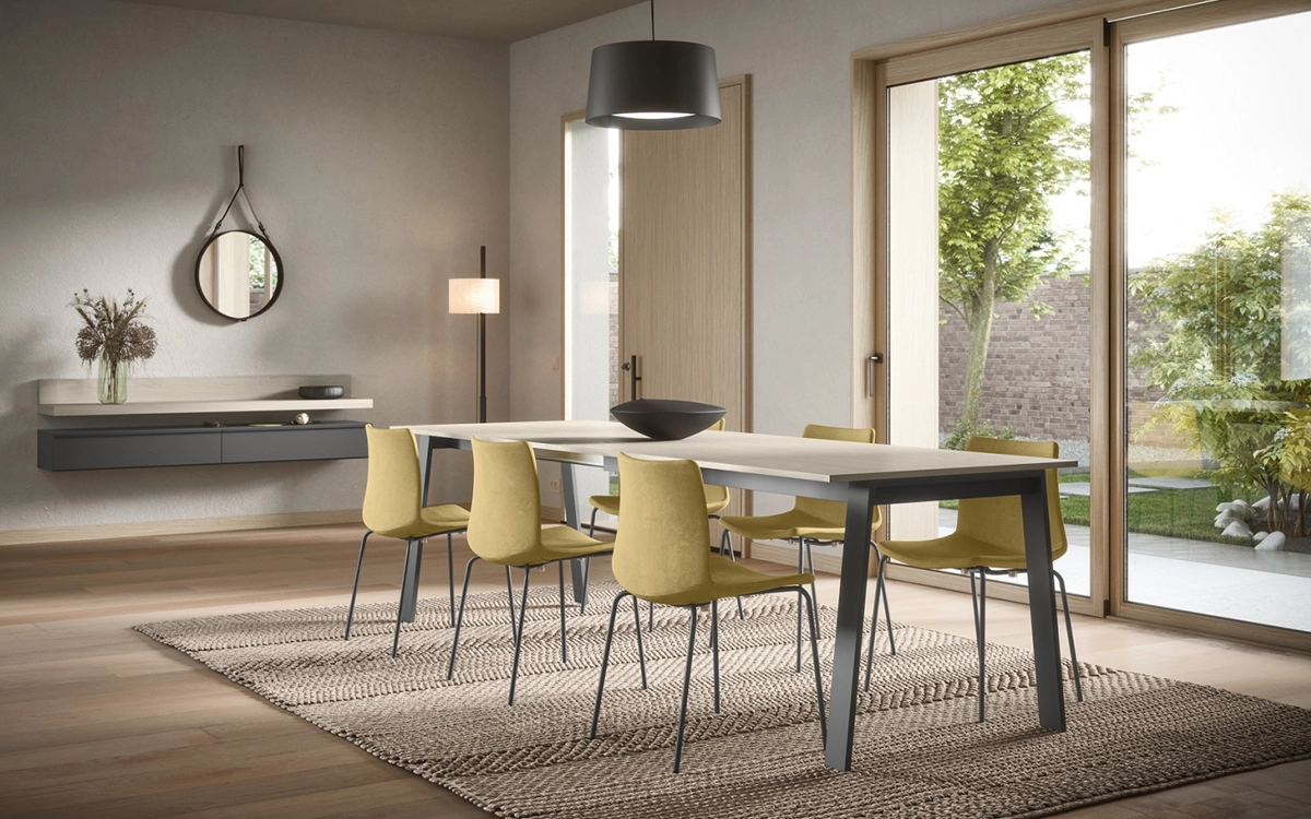 Geometrie essenziali caratterizzano il tavolo allungabile CORBY, disponibile anche in versione penisola. Il suo stile unico e la versatilità lo rendono perfetto per arredare il quotidiano.