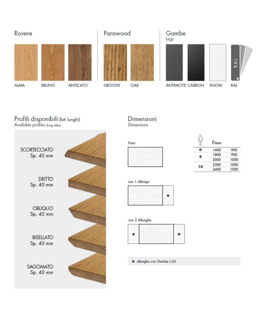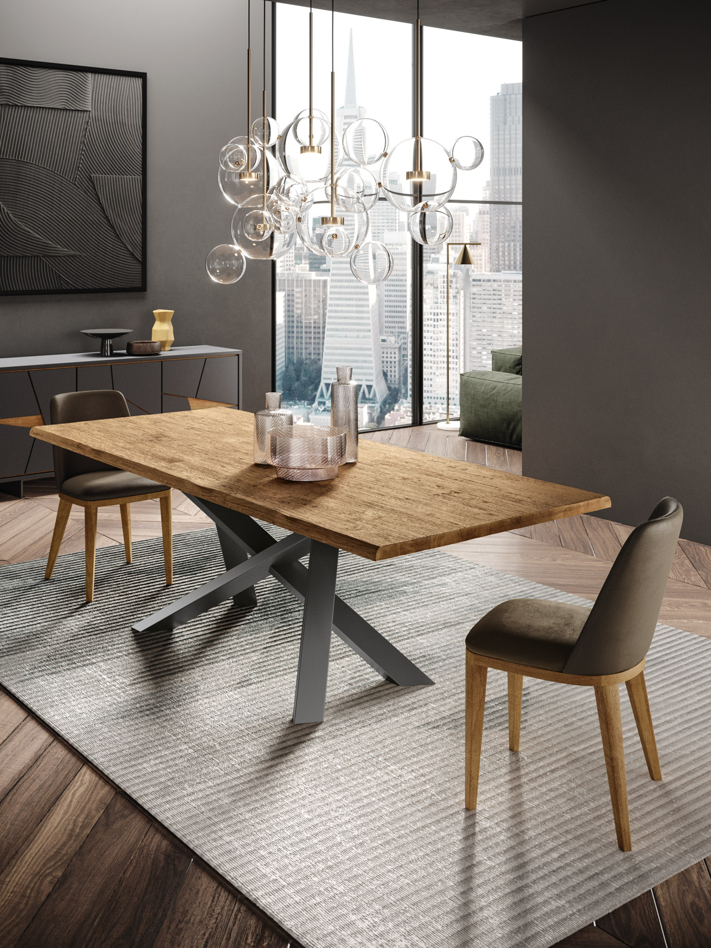 Il bordo del tavolo, in vero legno, può essere squadrato o scortecciato per un look naturale e autentico. Le gambe sono dotate di piedini regolabili con gommino antigraffio per un appoggio sicuro su ogni pavimento. Una delle peculiarità del tavolo Crossing è la possibilità di aggiungere allunghe, ideale per accogliere ospiti con praticità e comfort.