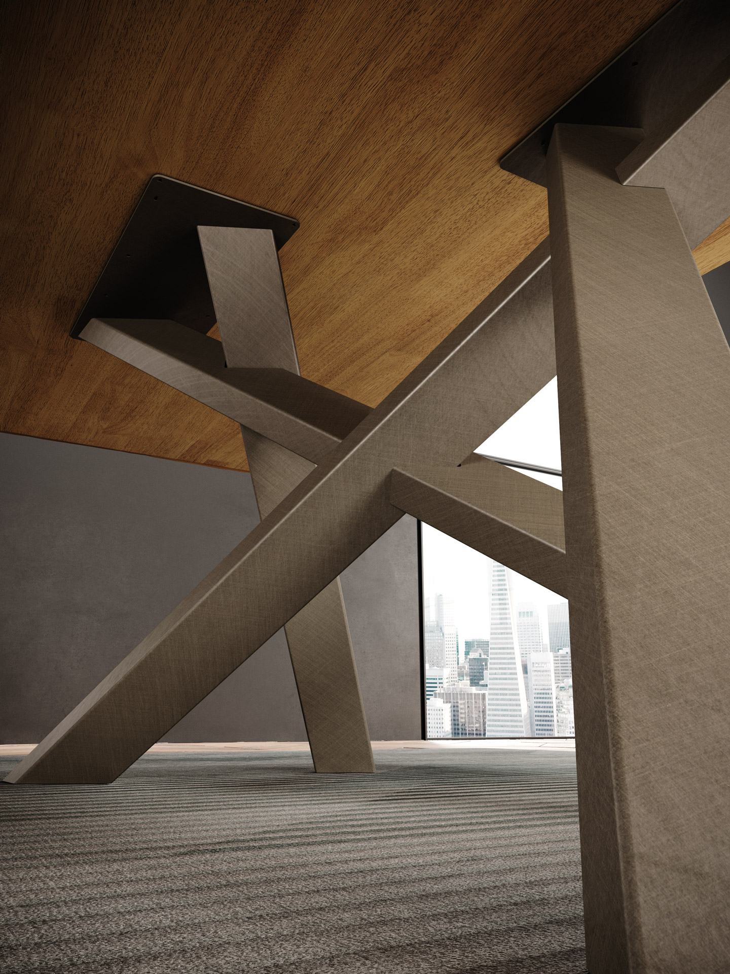 Il basamento del tavolo è realizzato con profilati in ferro di grande sezione, verniciati con finitura epossidica resistente e antigraffio, disponibile anche in tutti i colori RAL. Grazie al taglio laser e alla saldatura in pezzo unico, risulta robusto, stabile e di grande impatto estetico.
