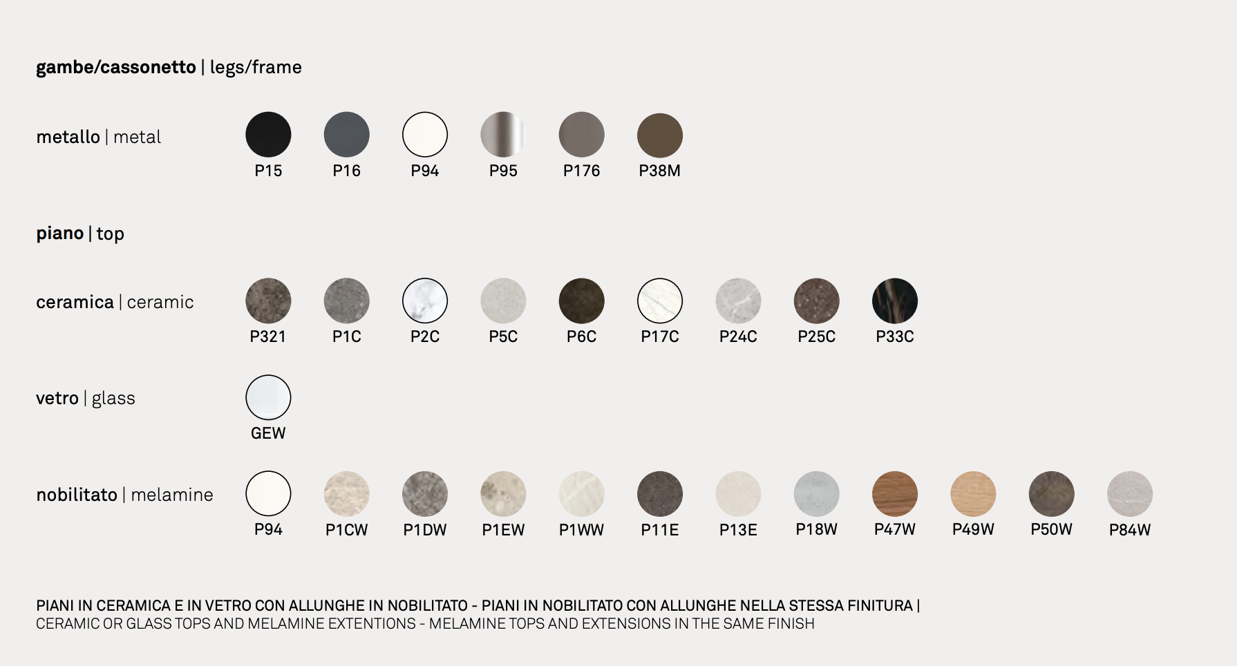 Tavolo allungabile con basamento in metallo. La caratteristica di questo modello è la gamba a forma pentagonale conica, da cui il nome Pentagon.Questa base può essere abbinata a piani in nobilitato, in vetro e ceramica, con una o più allunghe, per adattarsi ad ogni esigenza di spazio e di stile. Il sistema di allunga prevede un cassonetto estensibile e gambe sempre perimetrali, con utilizzo di ruote in gomma morbida posizionate sotto alle gambe che si spostano.