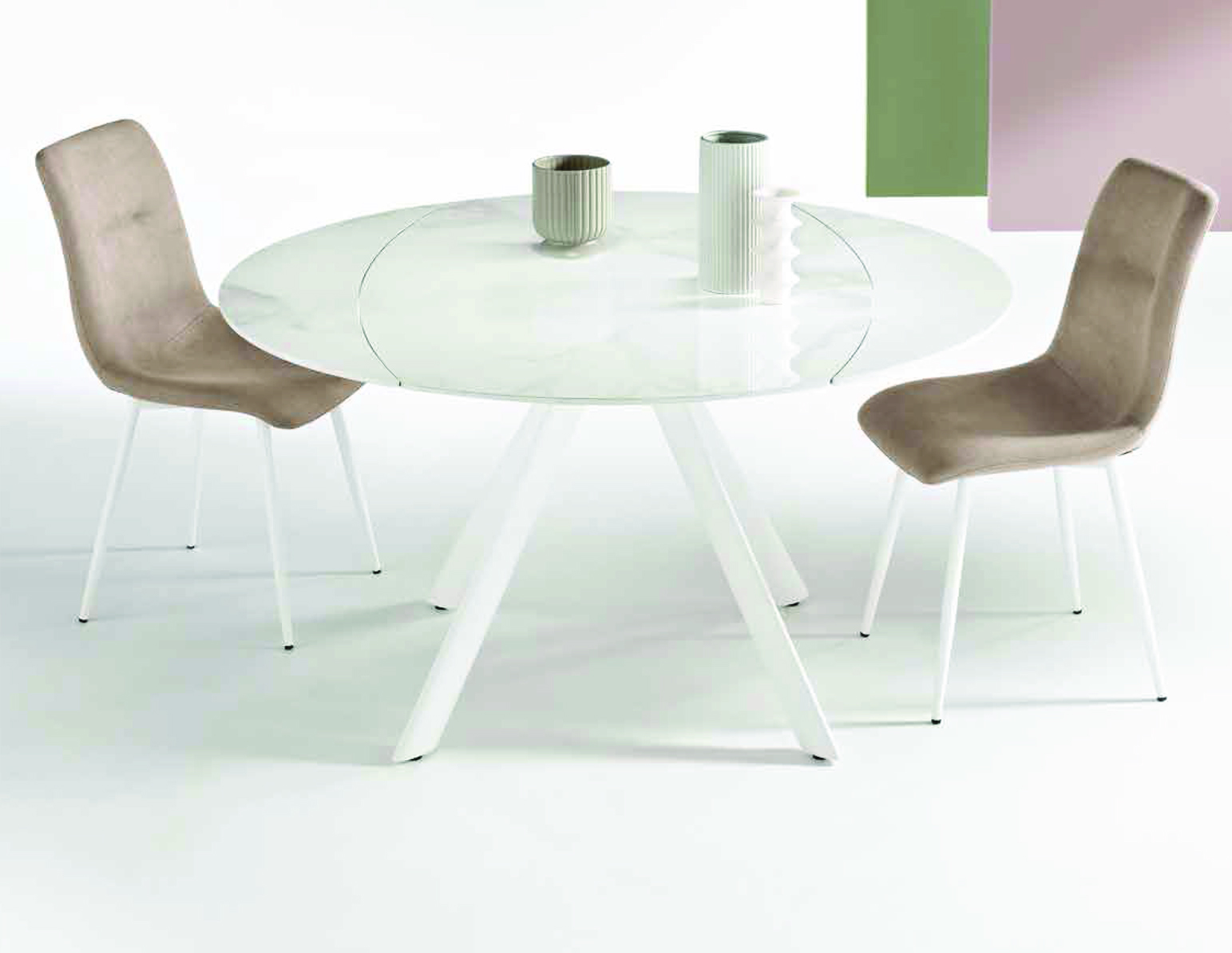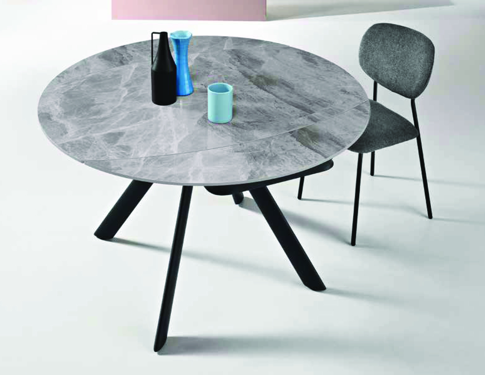 Tavolo allungabile in pietra sinterizzata effetto marmo con piano girevole che si trasforma in rotondo e due allunghe da 24 cm; base in metallo verniciato.
