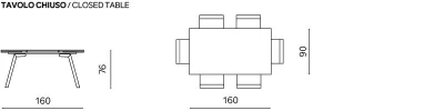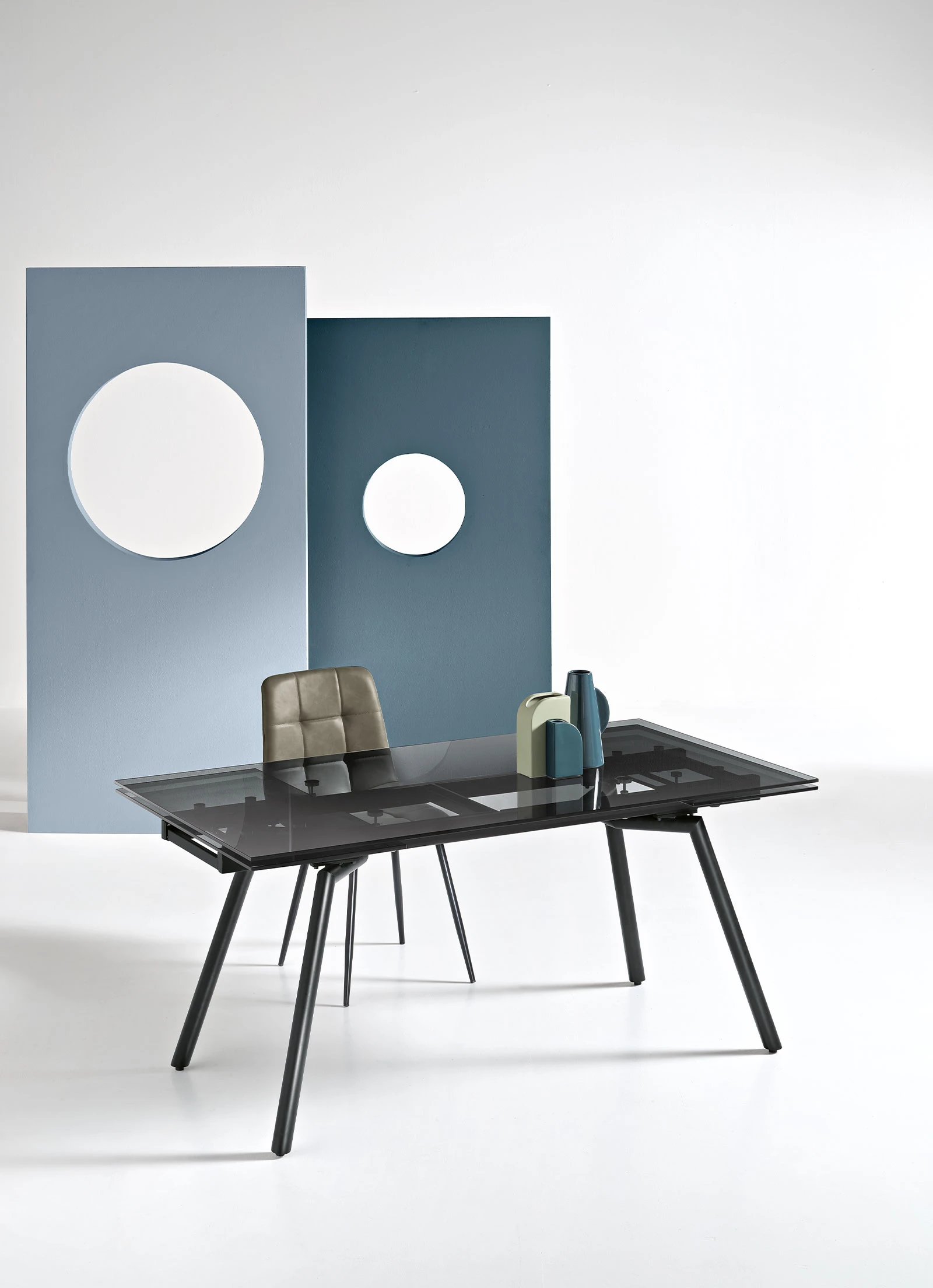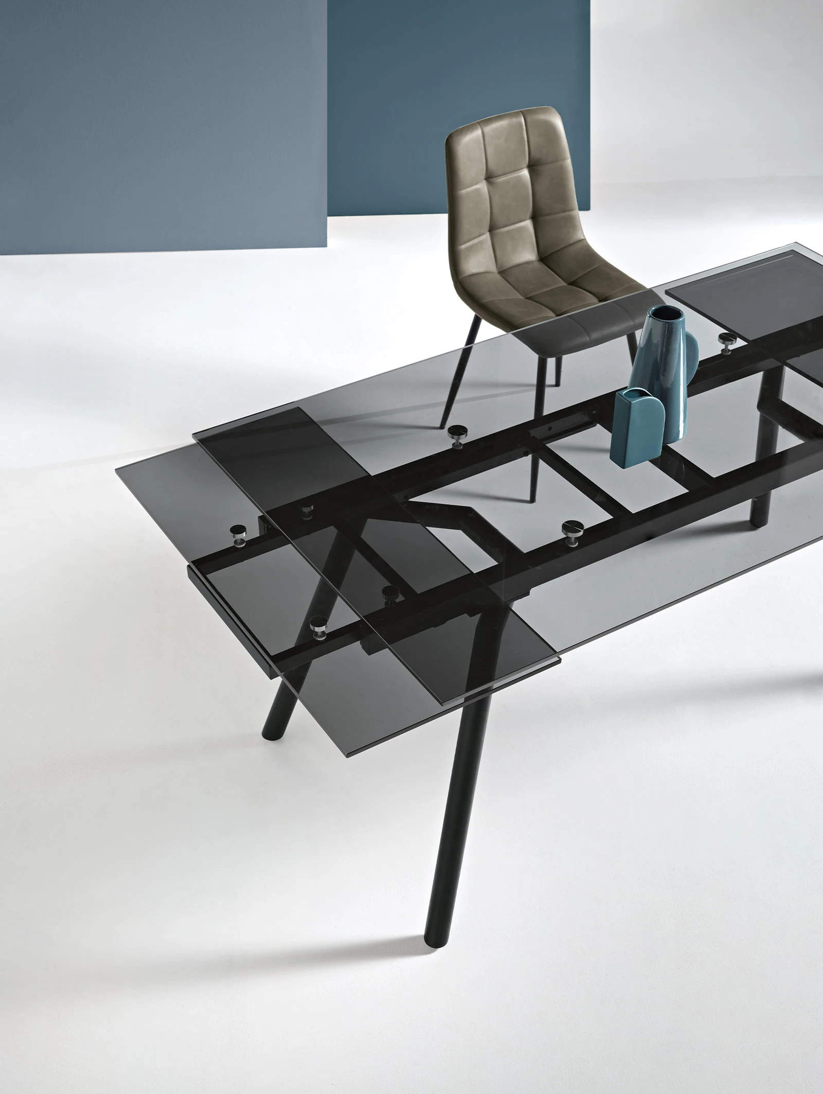 Tavolo allungabile con due allunghe da 40 cm. Piano in vetro e base in metallo verniciato.