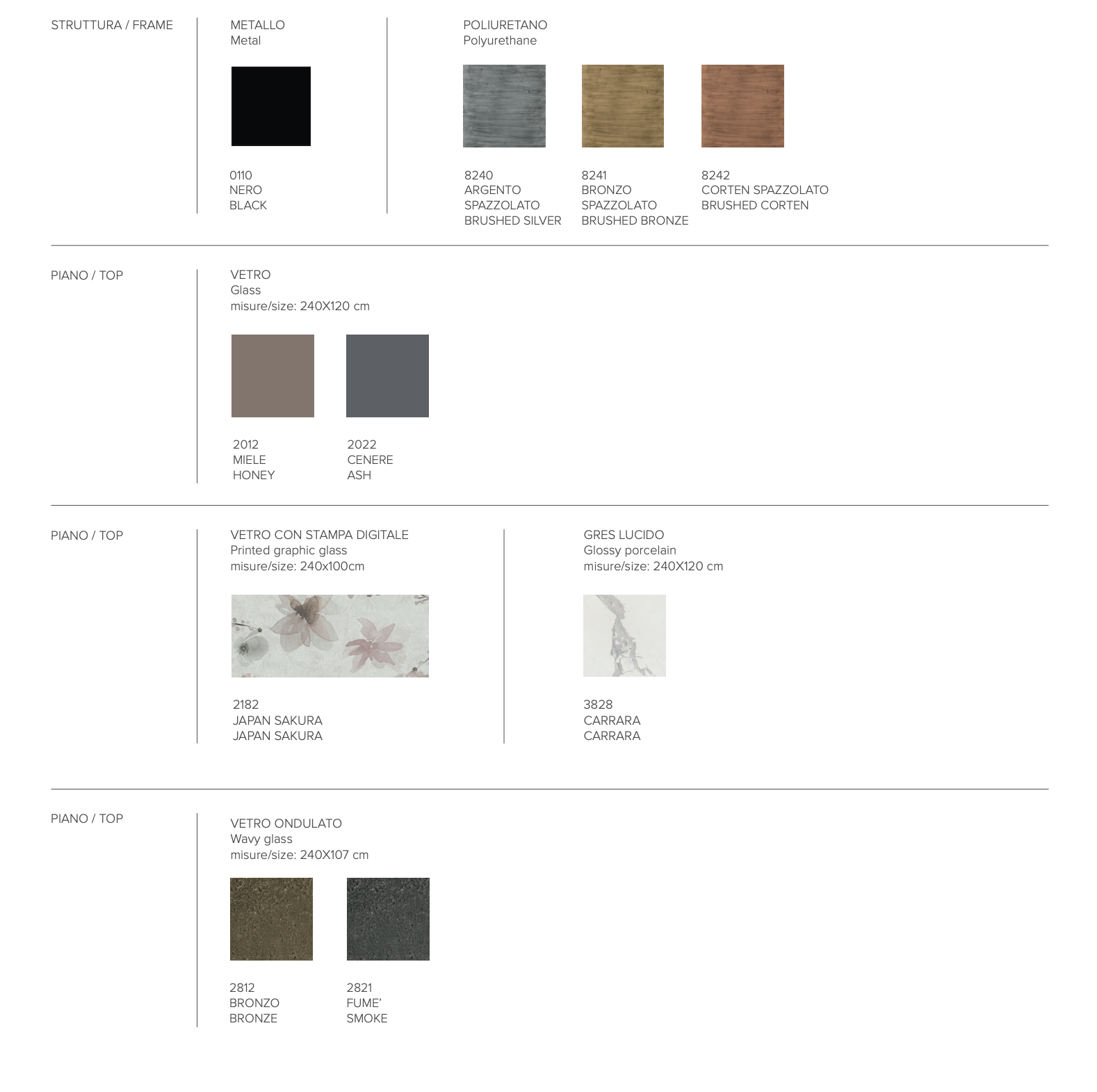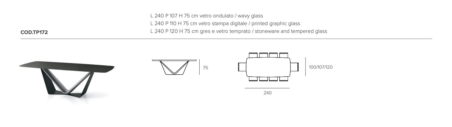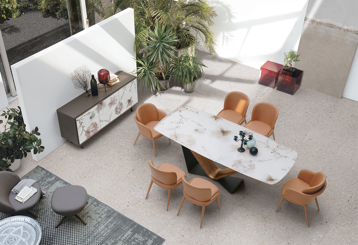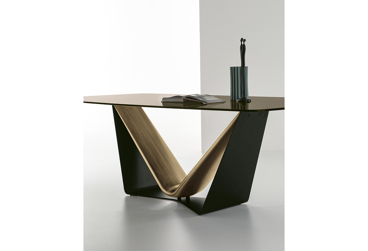 Tavolo moderno con basamento in metallo e poliuretano disponibile con piano rettangolare o a botticella in vetro ondulato, vetro con stampa digitale o gres porcellanato lucido. Gli angoli arrotondati del piano si uniscono al dinamismo del basamento, entrambi disponibili in diversi materiali e finiture.