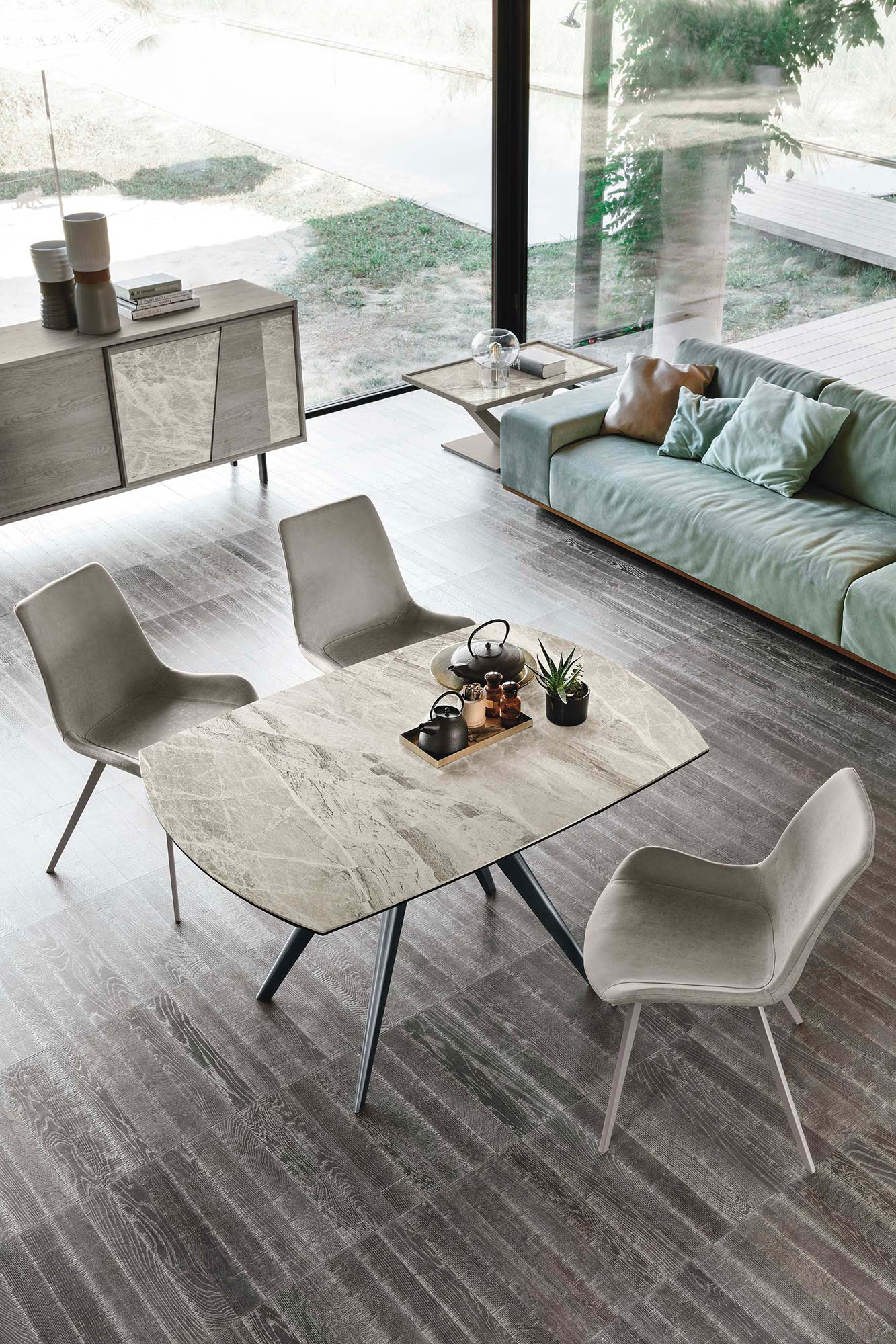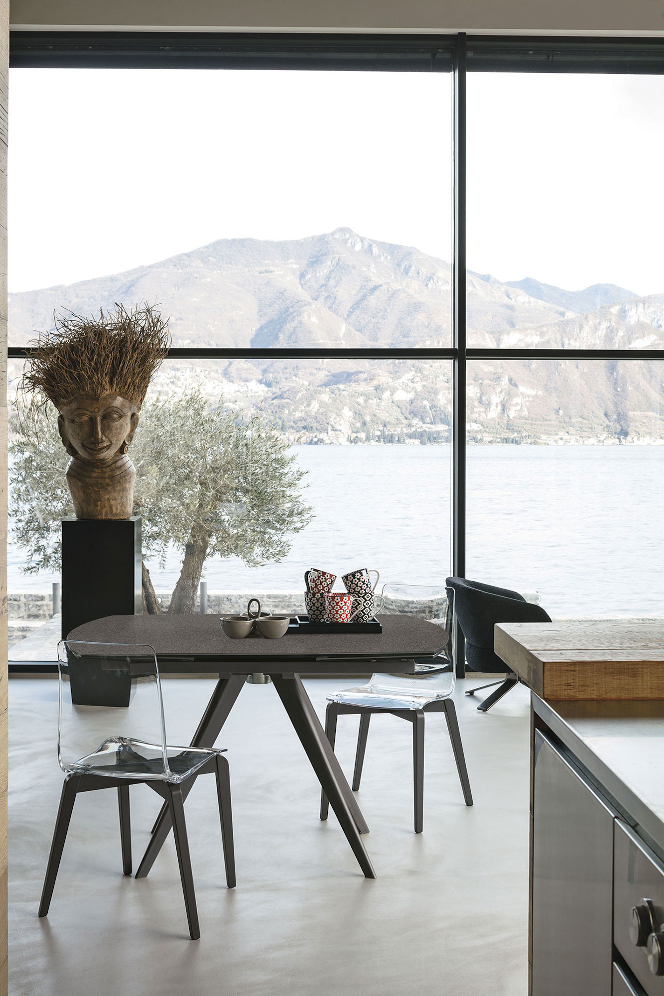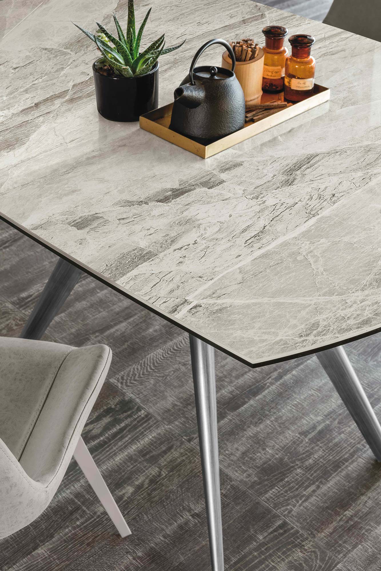 Il piano in solido gres porcellanato o in vetro temperato di alta qualità e le diverse finiture disponibili rendono VORTICE un tavolo facilmente abbinabile nei più diversi contesti.