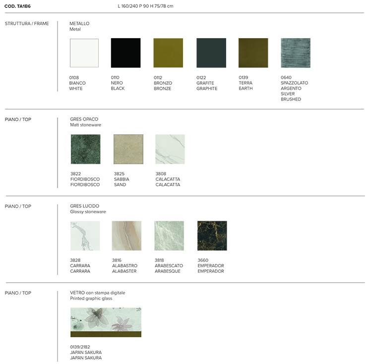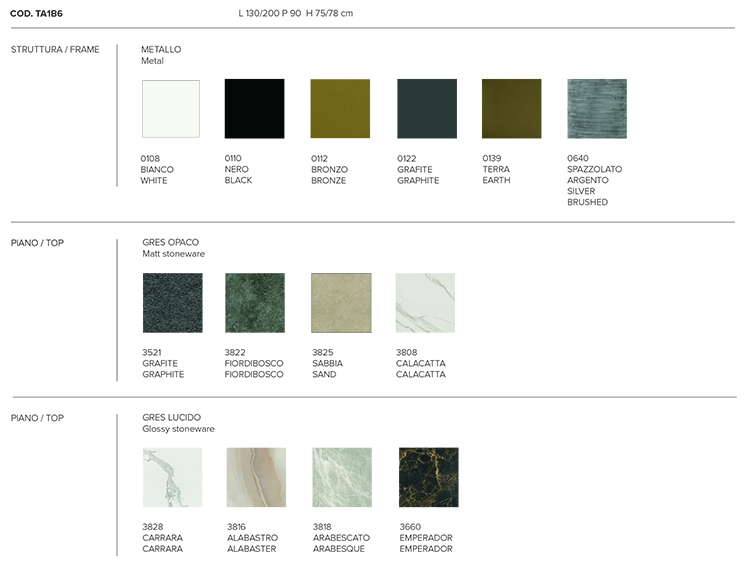 Basta scoprire e provare le sfumature e gli effetti di tutte le finiture: la struttura può essere scelta nel color bianco, grafite, corda, marrone vintage o silver spazzolato, mentre il piano lo si può avere nel classico effetto del marmo di carrara, con il moderno effetto cemento e grafite, con il fantasioso effetto del marmo arabescato, o con il caldo marmo emperador.